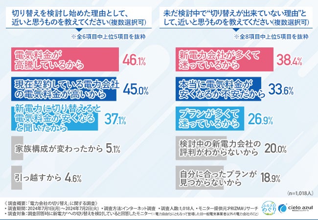株式会社cielo azul(本社所在地:福岡県福岡市、代表取締役:大泉 聡)は、調査回答時に新電力への切り替えを検討していると回答したモニターを対象に、「電力会社の切り替え」に関する調査を実施しました。