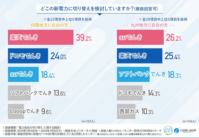 四国地方在住の方に「どこの新電力に切り替えを検討していますか?(複数回答可)」と質問したところ、『楽天でんき(39.2%)』と回答した方が最も多く、次いで『ドコモでんき(24.0%)』『auでんき(18.4%)』となりました。