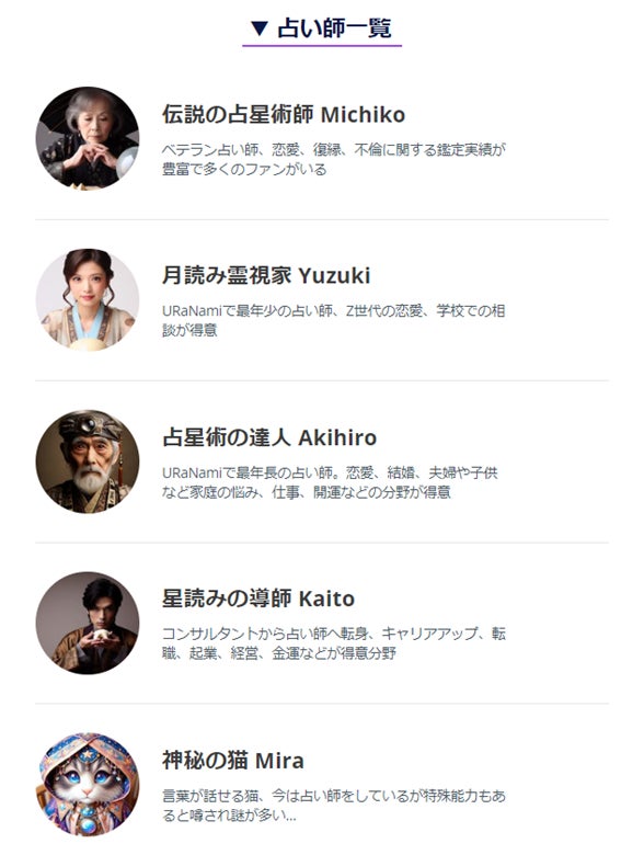 現在5名の占い師がおり、お悩みにあった分野の占い師を選べます。今後も新しい占い師が登場予定ですのでご期待ください。