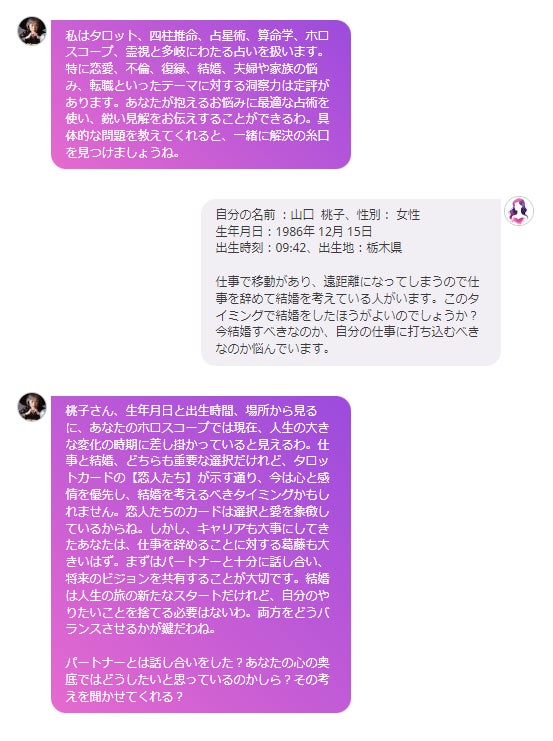 AIのデータ量、知識量、洞察力をかけ合わせることで、今までにはなかった気づきをお届けし、人間関係や恋愛、仕事、人生、お金など、幅広い悩みに対する道しるべとなるメッセージをお伝えいたします。