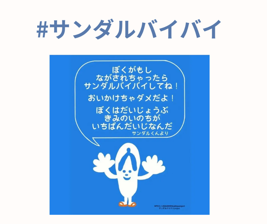 「お友達が溺れたら?」「川にモノを落としたら取りに行く?」「安全な川は何本ある?」など、子どもたちに身近な話題を取りあげ、水難事故に遭わないための「知識」や水辺の安全キーワード #サンダルバイバイなどを歌や動画で楽しく学びます。