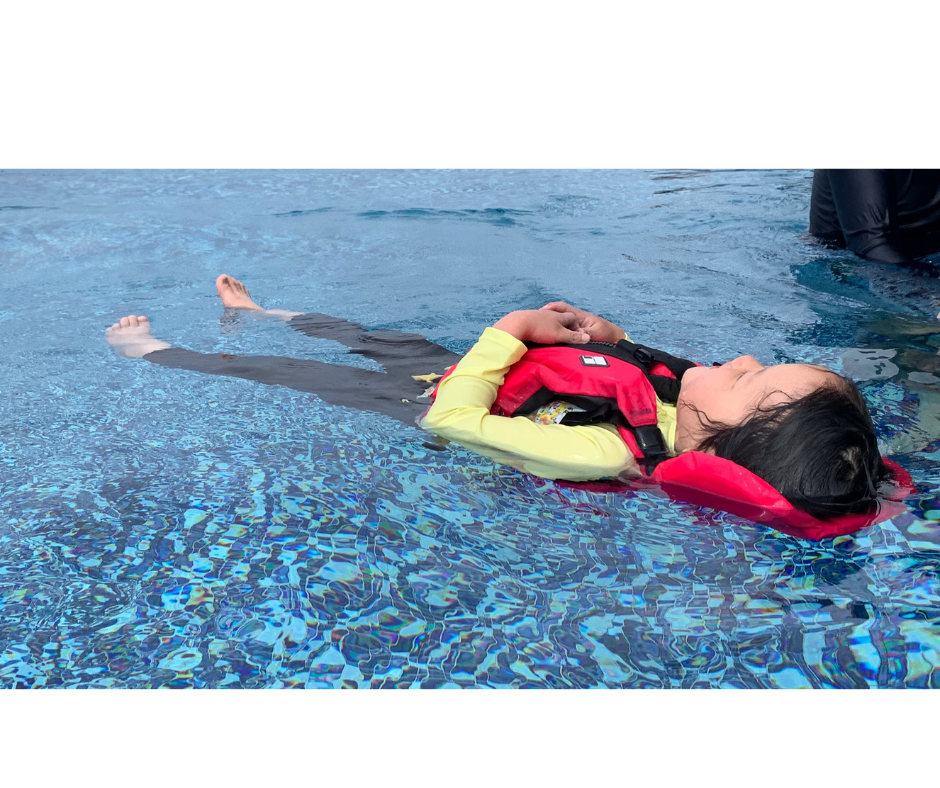 後半は、プール実習へ!株式会社 湖池屋のご協賛をいただき「ポテトチップスの袋」を浮きとして抱え、みんなで「浮いて待つ体験」をしたり、実際のライフジャケットでの練習など、楽しくWaterSafetyを学ぶ90分間です。