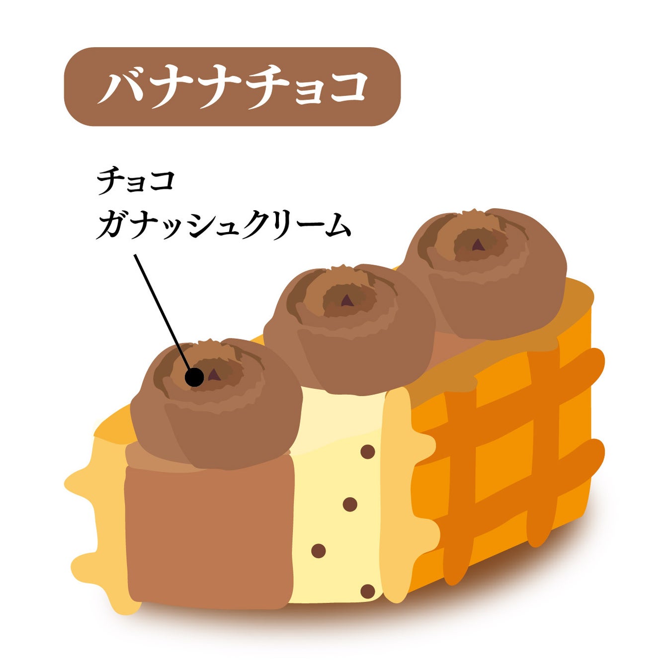 食感を楽しめるチョコチップ入りのバナナクリームとなめらかでコクのあるチョコカスタードクリームを、プレーンのワッフル生地でサンド。