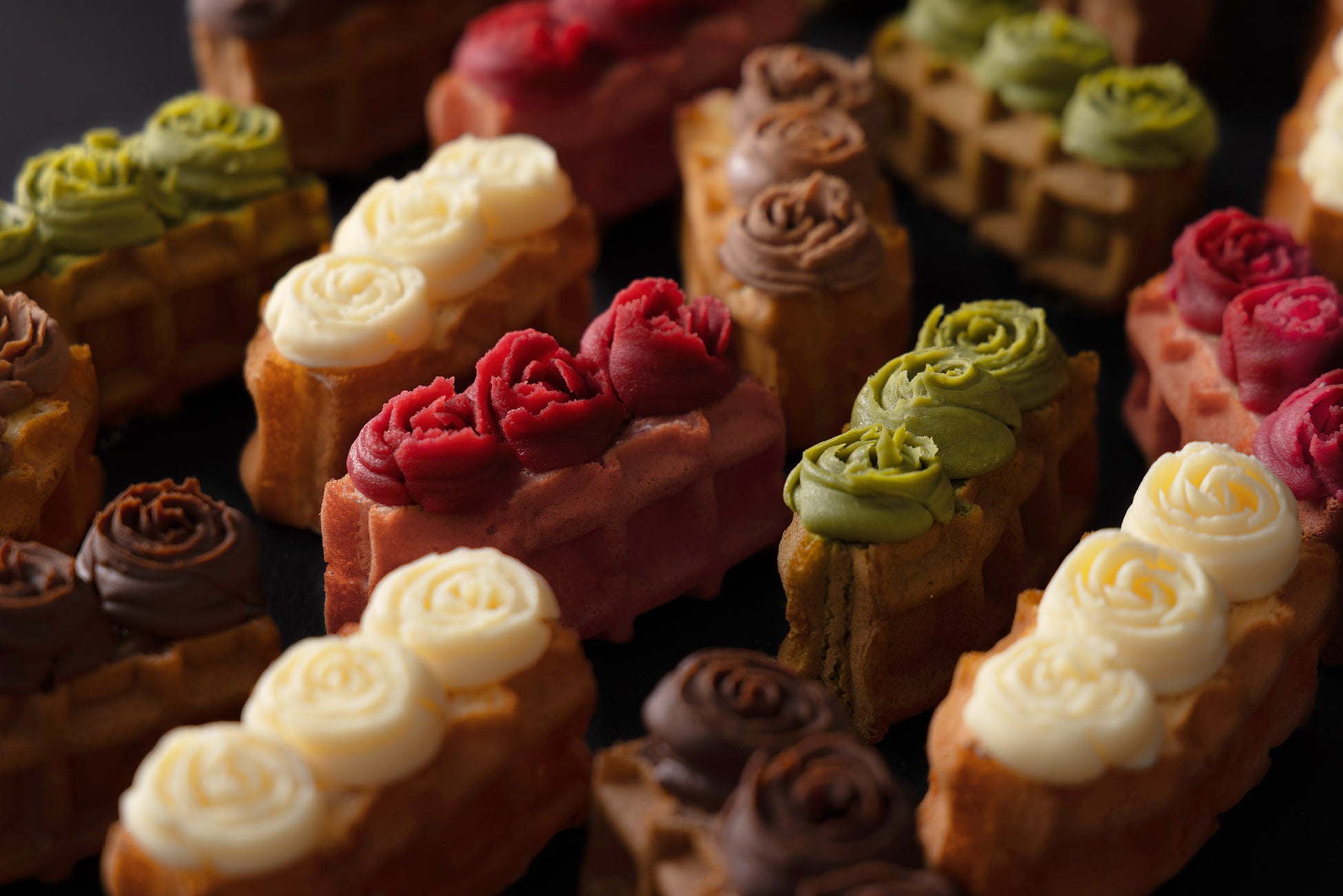 フランボワーズやオレンジ、バナナといったフルーツ、チョコや抹茶などの多彩な素材とふわふわのワッフルのハーモニーが楽しめる5種は、まるでローズガーデンのような華やかさです。