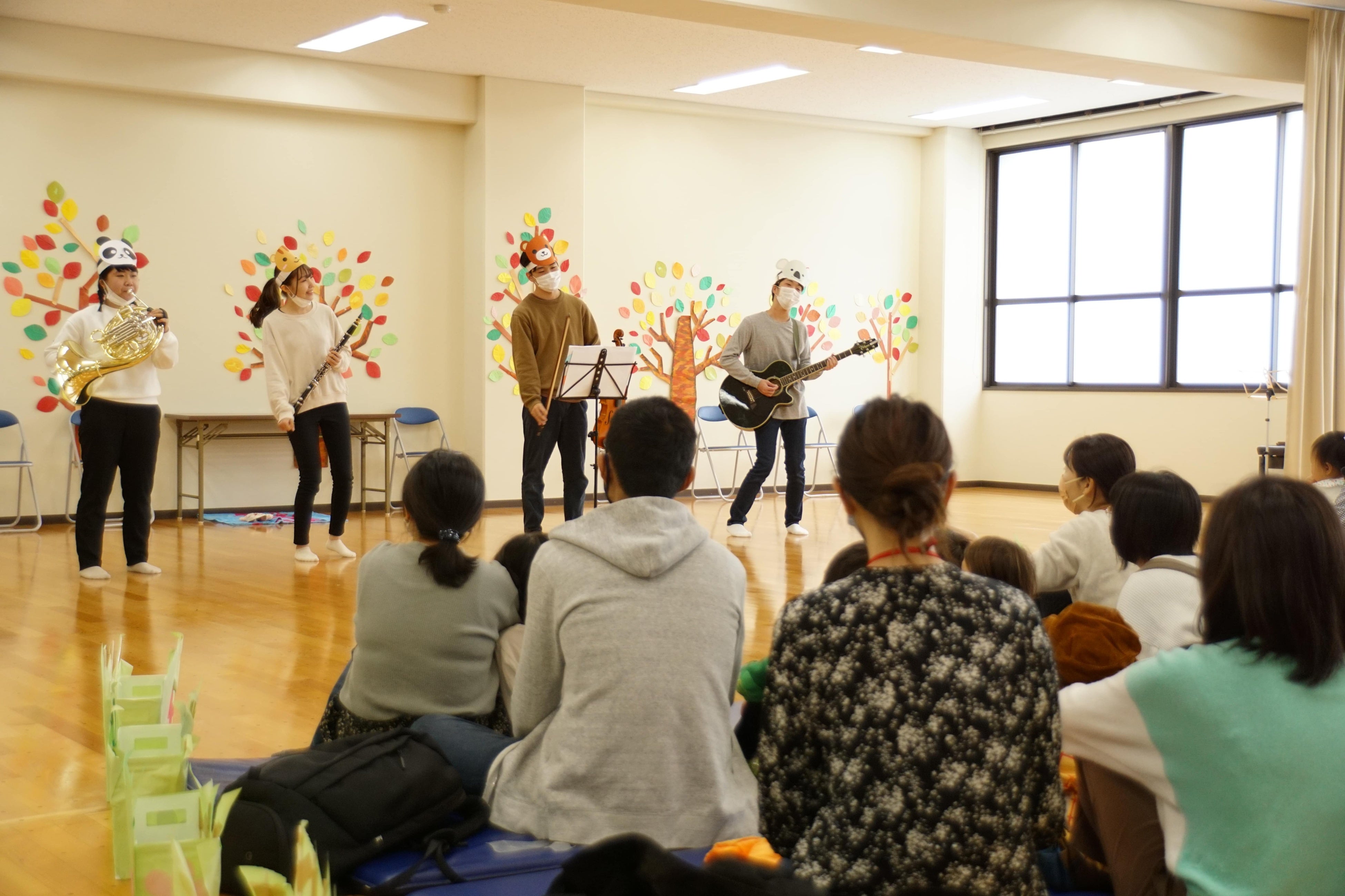 リトミック活動や手遊び、演奏や歌唱活動を子どもと保護者が一緒になって取り組めるような参加型の企画です。秋にちなんだ曲を使ったり、落ち葉やトンボの装飾を施したりと、季節を耳から、そして目からも感じられるようなコンサートです。