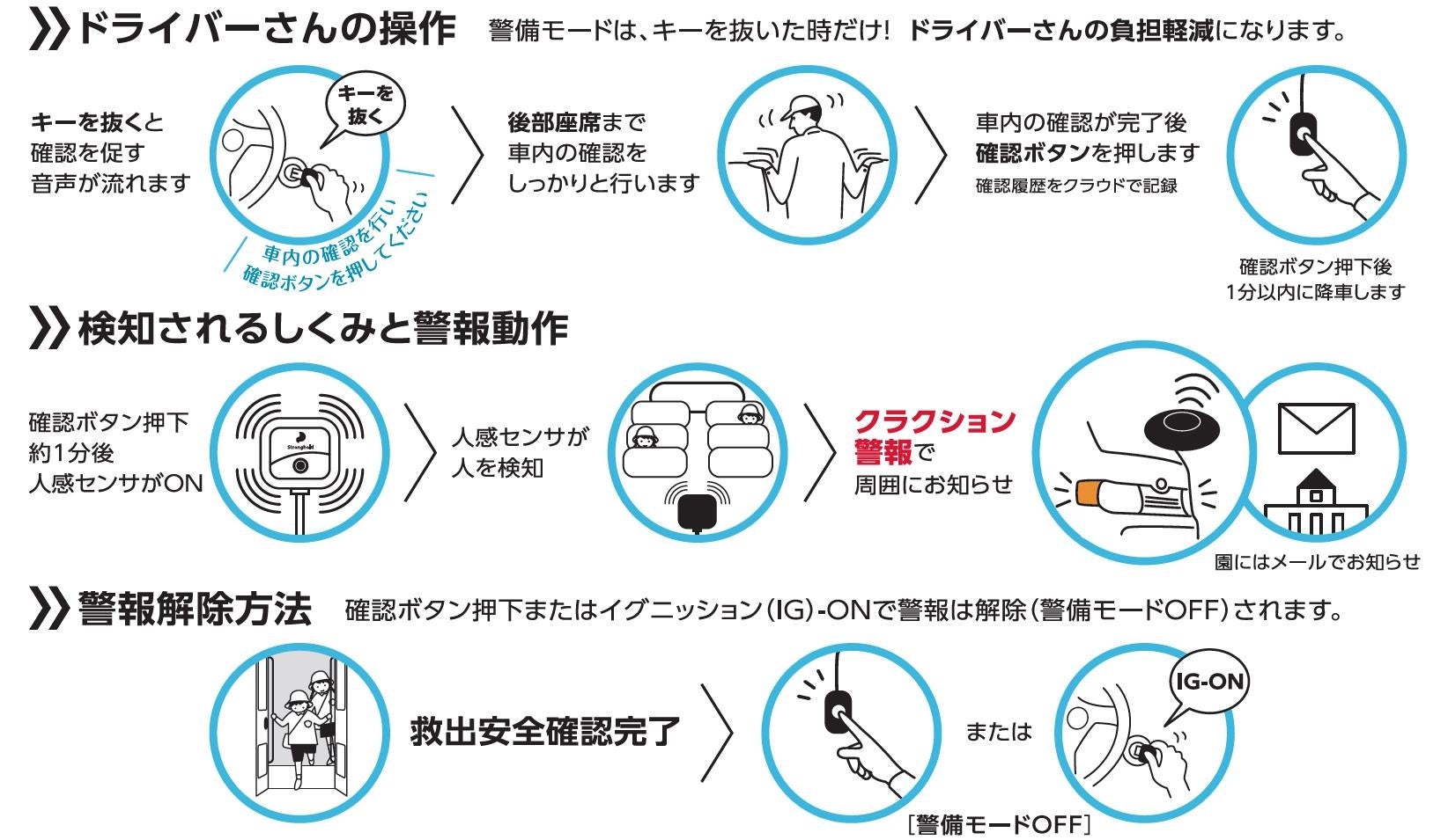 実証実験の結果から、「送迎をしていない、給油や掃除・整備等でもエンジンを停止する度に、スイッチを押さなければならず、とても負担だ」という多くのご意見から、キー抜き取り連動式を採用しました。キーを抜いて、車内安全確認が完了したら、「確認ボタン」を押すだけの簡単な操作で作動します。