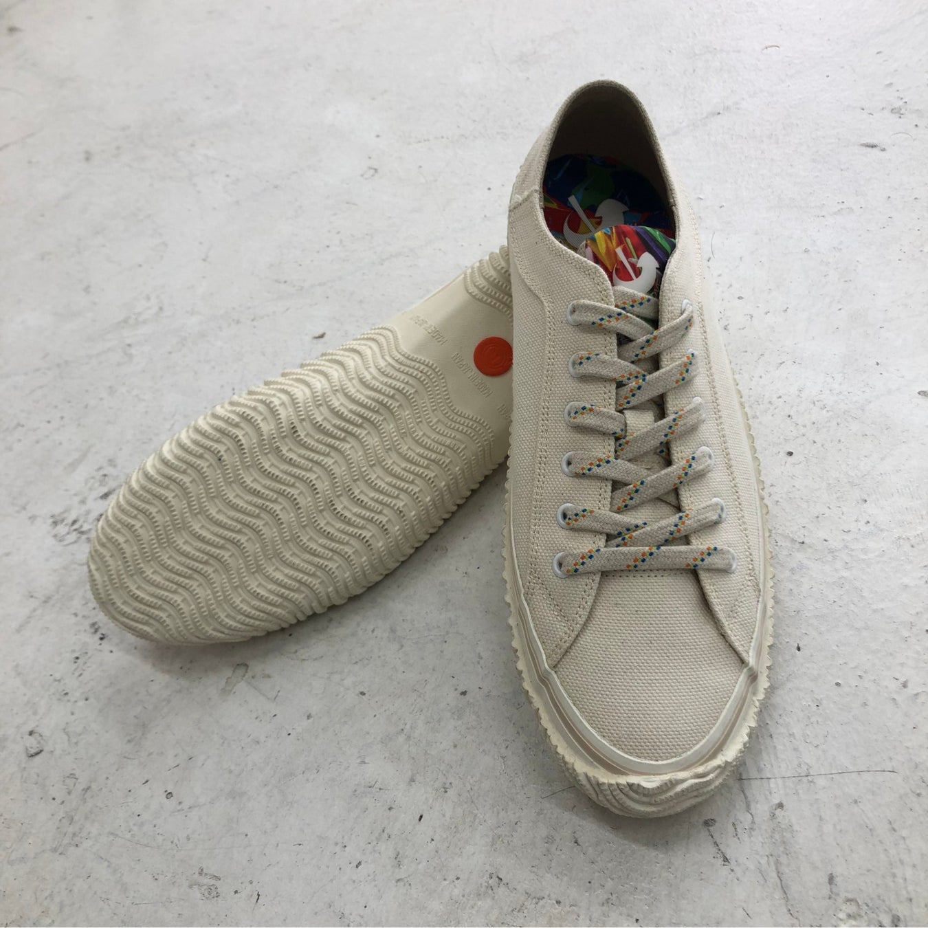 ・バルカナイズ製法で生産。色は生成りのみ。XS~XL(ユニセックス)の全7サイズ展開。