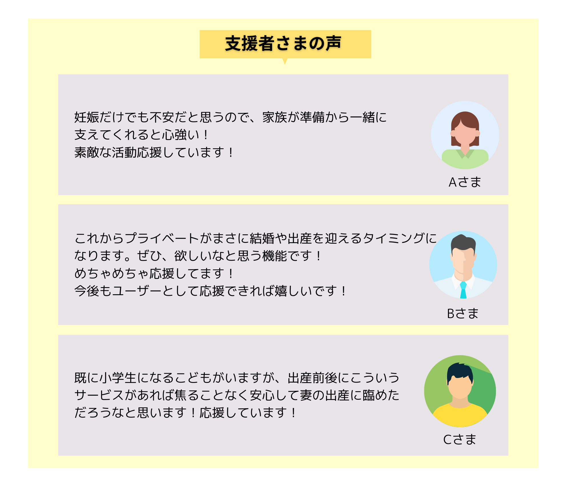 今後は賛同いただきました支援をもとに、さまざまな切り口を用意しながら、夫婦協働の出産準備の仕組みを広めていきます。