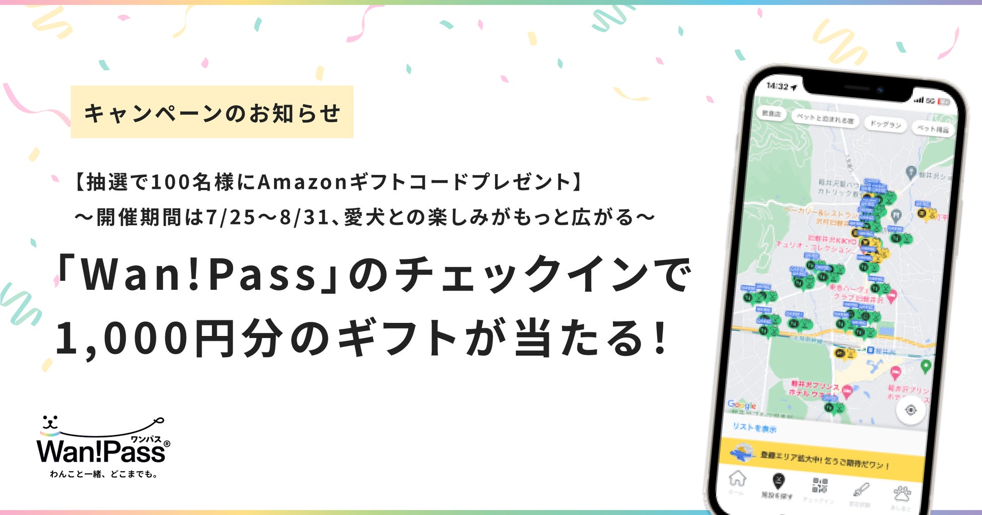 【抽選で100名様にAmazonギフトコードプレゼント】ペットお出かけ支援アプリ「Wan!Pass(ワンパス)」チェックインキャンペーン開催