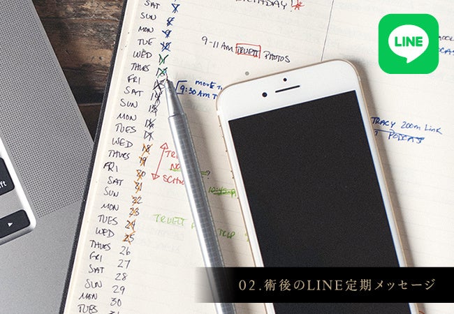 ダウンタイム期間には、術後の経過に合わせたフォローメッセージを、LINEで定期的に配信いたします。今見られる症状はいつまで続くのか。この症状は想定の範囲なのか。こうした疑問にお答えし、万一異常があった場合も早期に気付けるようサポートします。