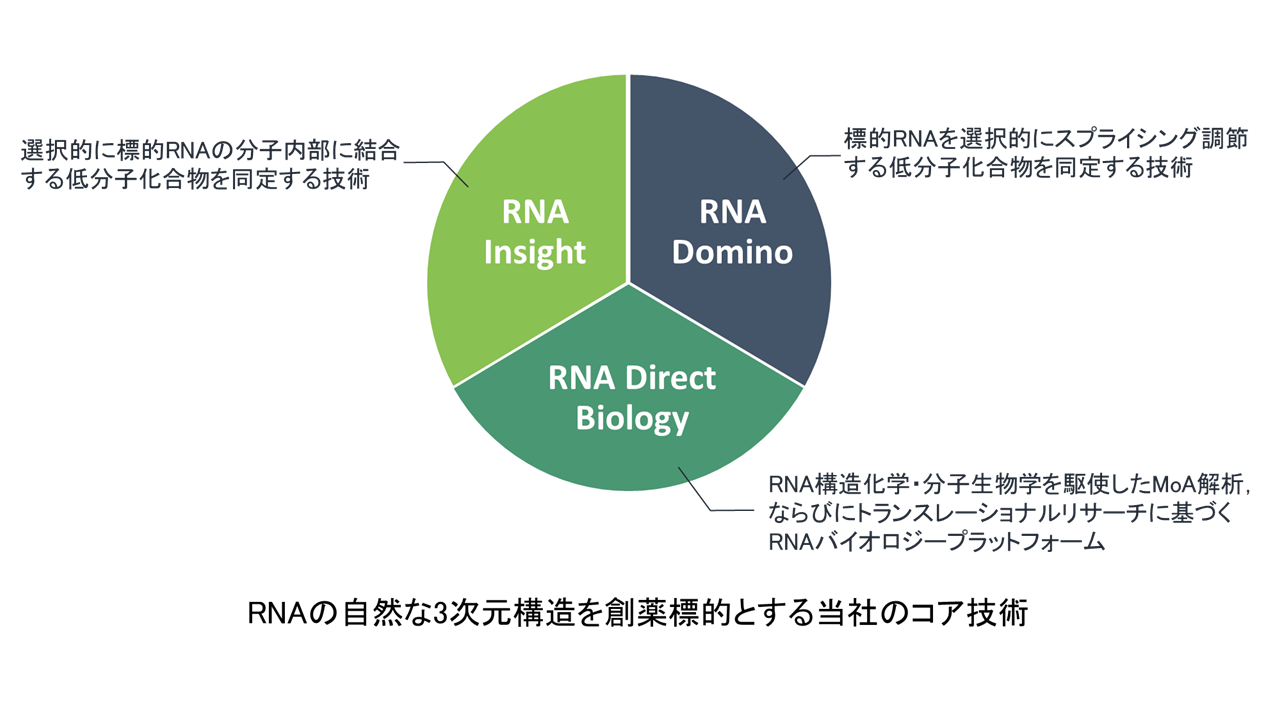 当社は2018年の創業以来、遺伝性希少疾患の領域において、RNAを標的とする経口投与可能な低分子医薬品の研究開発を行ってまいりました。当社が保有する独自のスクリーニング技術を含む創薬プラットフォームを通じて、脊髄性筋萎縮症の治療薬候補化合物をはじめ、前頭側頭型認知症やパーキンソン病をターゲットとする複数のパイプラインにおいて、候補物質の探索・創出を継続しております。当社の低分子化合物は、医薬品の効能を維持したまま副作用の低減を見込める点が評価され、グローバル大手製薬企業のバイオジェン社と共同研究およびオプション権付ライセンス契約を締結しております。