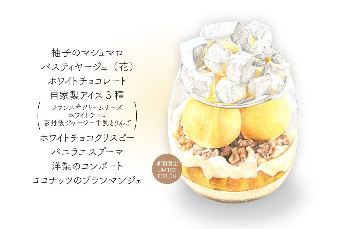 【内 容】柚子のマシュマロ・パスティヤージュ・ホワイトチョコレート・自家製アイス3種(フランス産クリームチーズ、ホワイトチョコ、京丹後ジャージー牛乳とりんご)・ホワイトチョコクリスピー・バニラエスプーマ・洋梨のコンポート・ココナッツのブランマンジェ