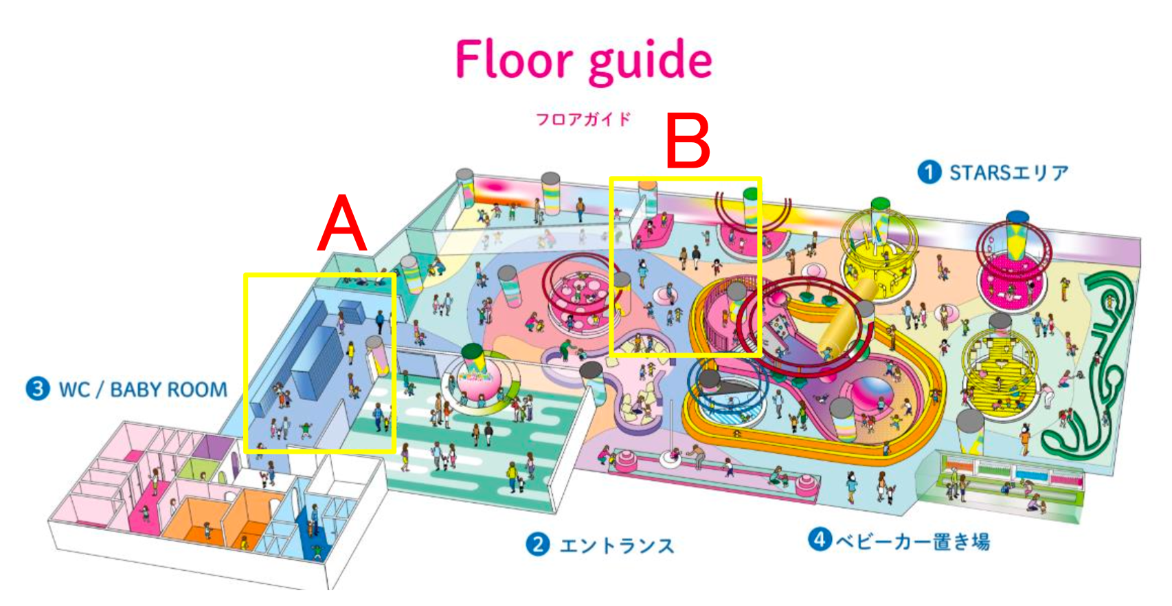 広告掲出場所は、下記のA(下駄箱入口)とB(施設中央遊具におけるゲームコーナー)