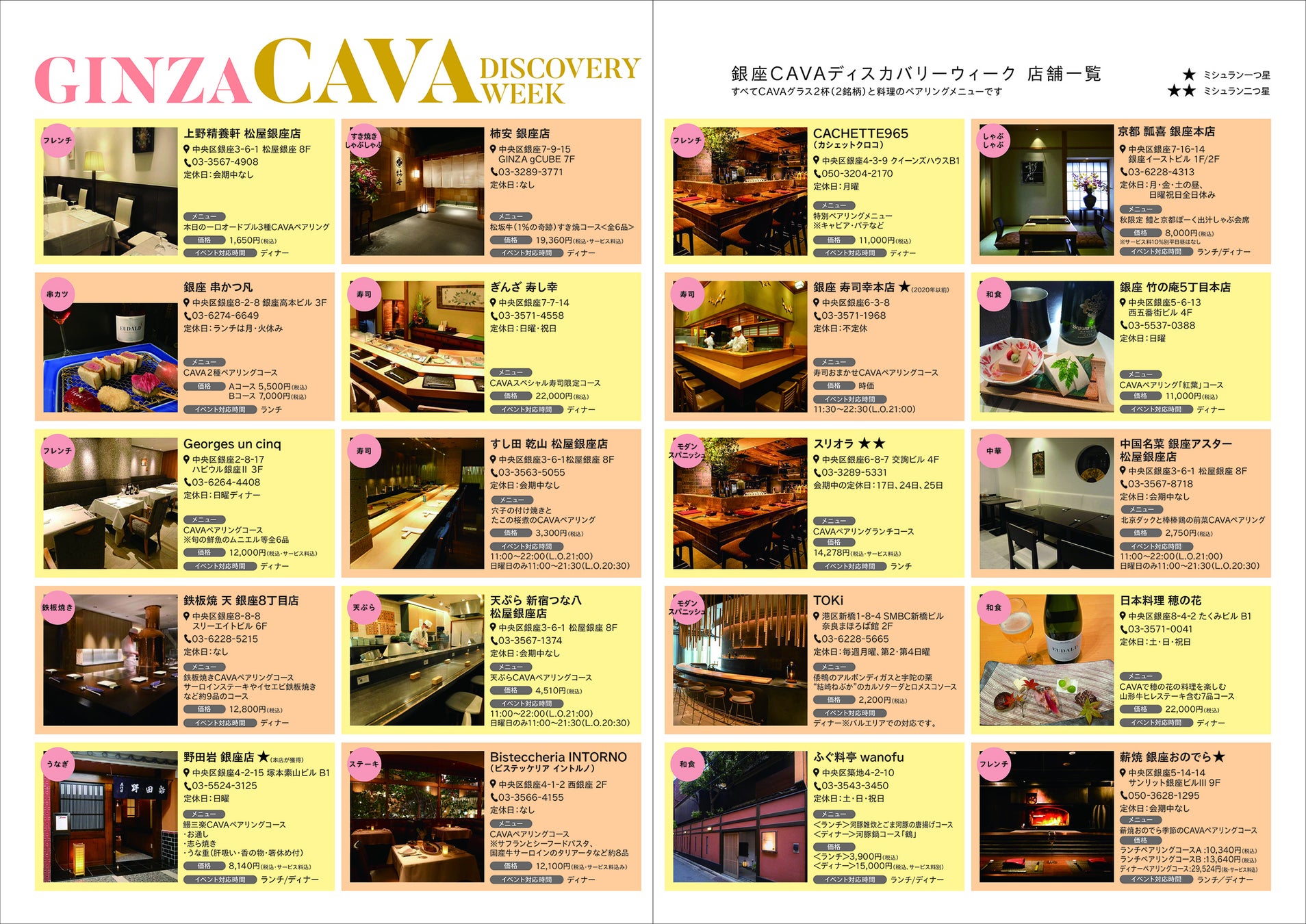 今年2年目となる「銀座CAVAディスカバリーウィーク」では、日本料理から、スペイン、フランス、中華料理など世界各国の料理を提供するミシュラン獲得店など銀座の有名店に、「松屋銀座」内の4つのレストランなど初参加の7店が加わり計20店舗が参加しています。