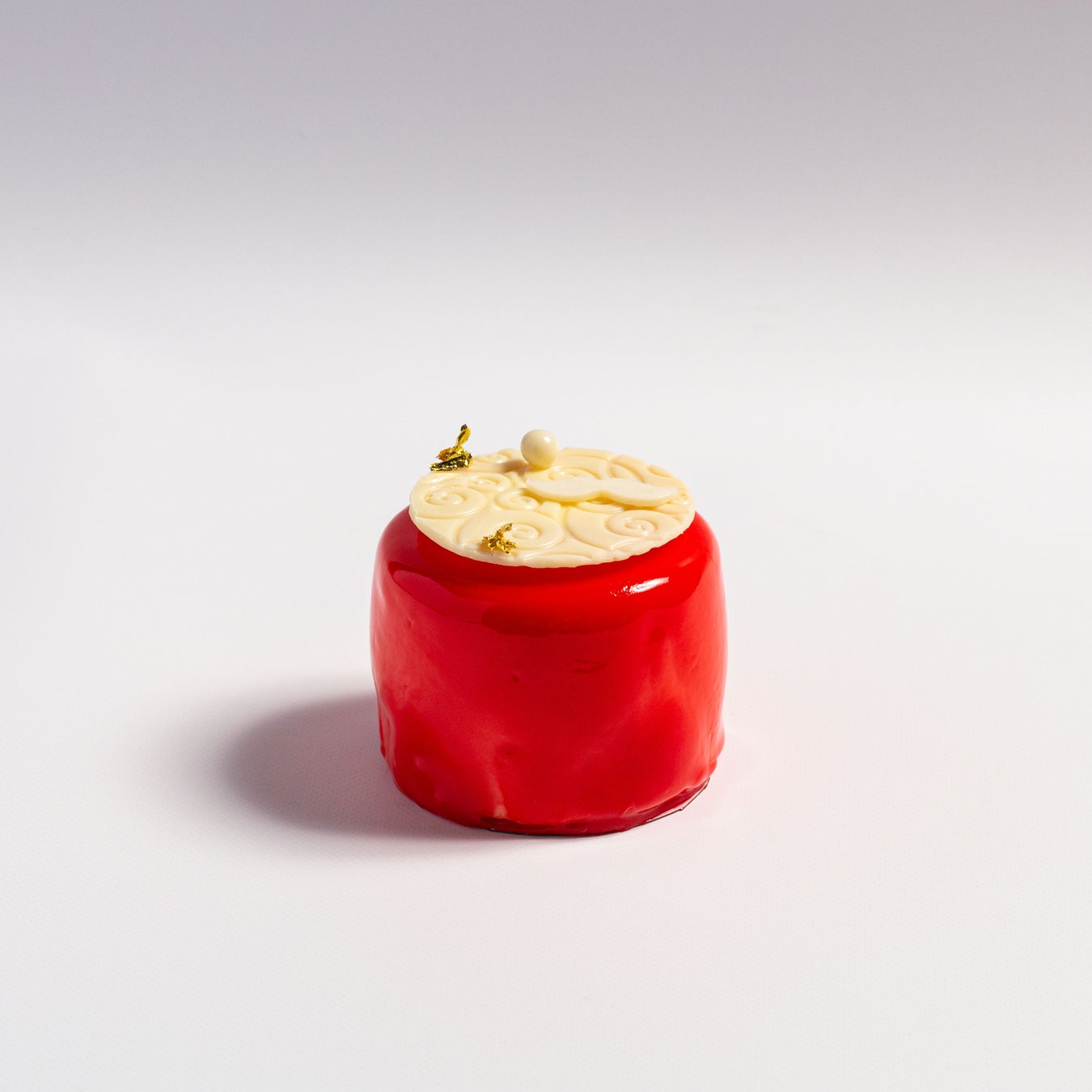 縁起物のだるまから着想を得て、鮮やかな赤をまとったスイーツを開発しました。店のロゴにも採用した梅をイメージし、梅酒のムースをベースに、梅酒とラズベリーのジュレ、アプリコットの果肉、アプリコットジュレなど様々な味わいを詰め込んだ当店のシグネチャースイーツです。