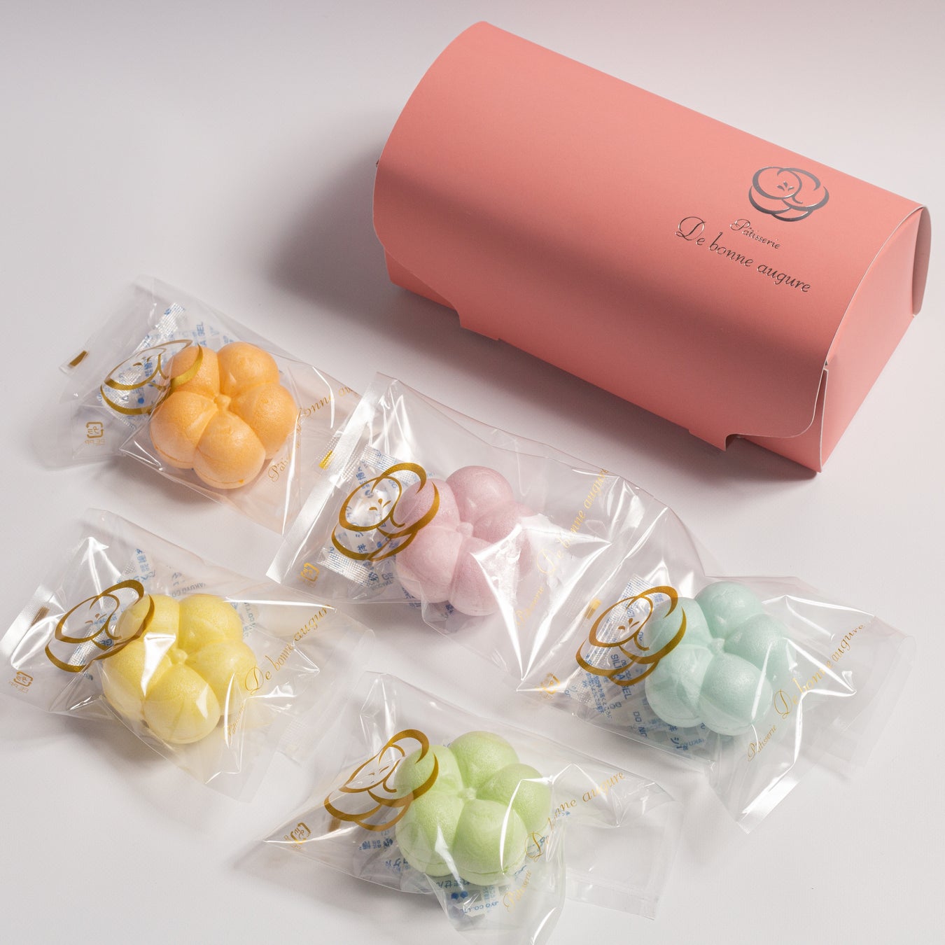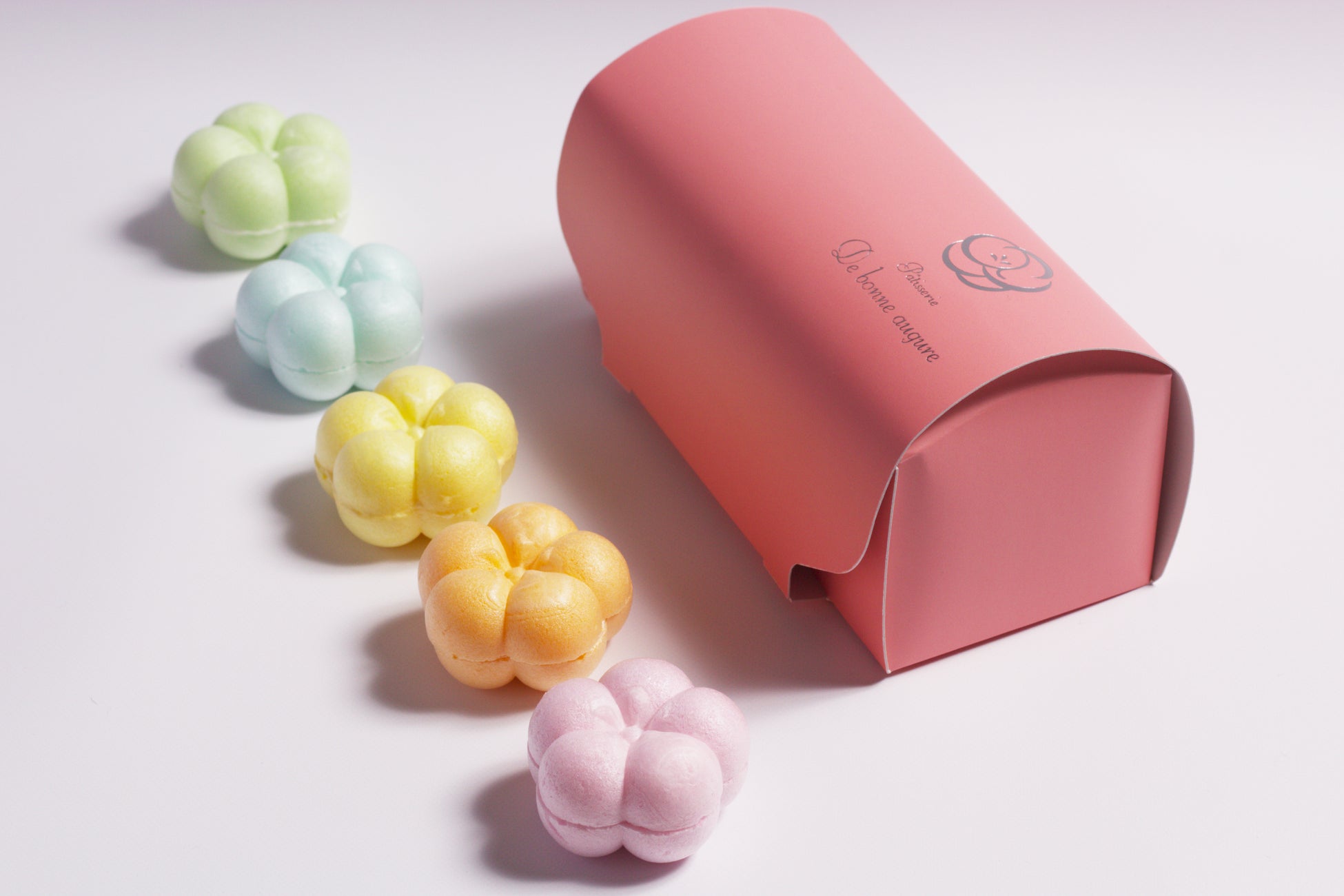 プレオープンの2日間は、オープン記念特典として当店の名物「もなかマシュマロ」を、セット商品ご購入の方1名につき1個プレゼントいたします。縁起の良い梅をモチーフにしたもなかの皮の中には、フルーツジャムとマシュマロが入っています。色とりどりの「もなかマシュマロ」はそれぞれキウイ、ベリー、パッションフルーツ、ブラッドオレンジ、カシス、塩レモンとバラエティー豊かな味わいをお楽しみいただけます。