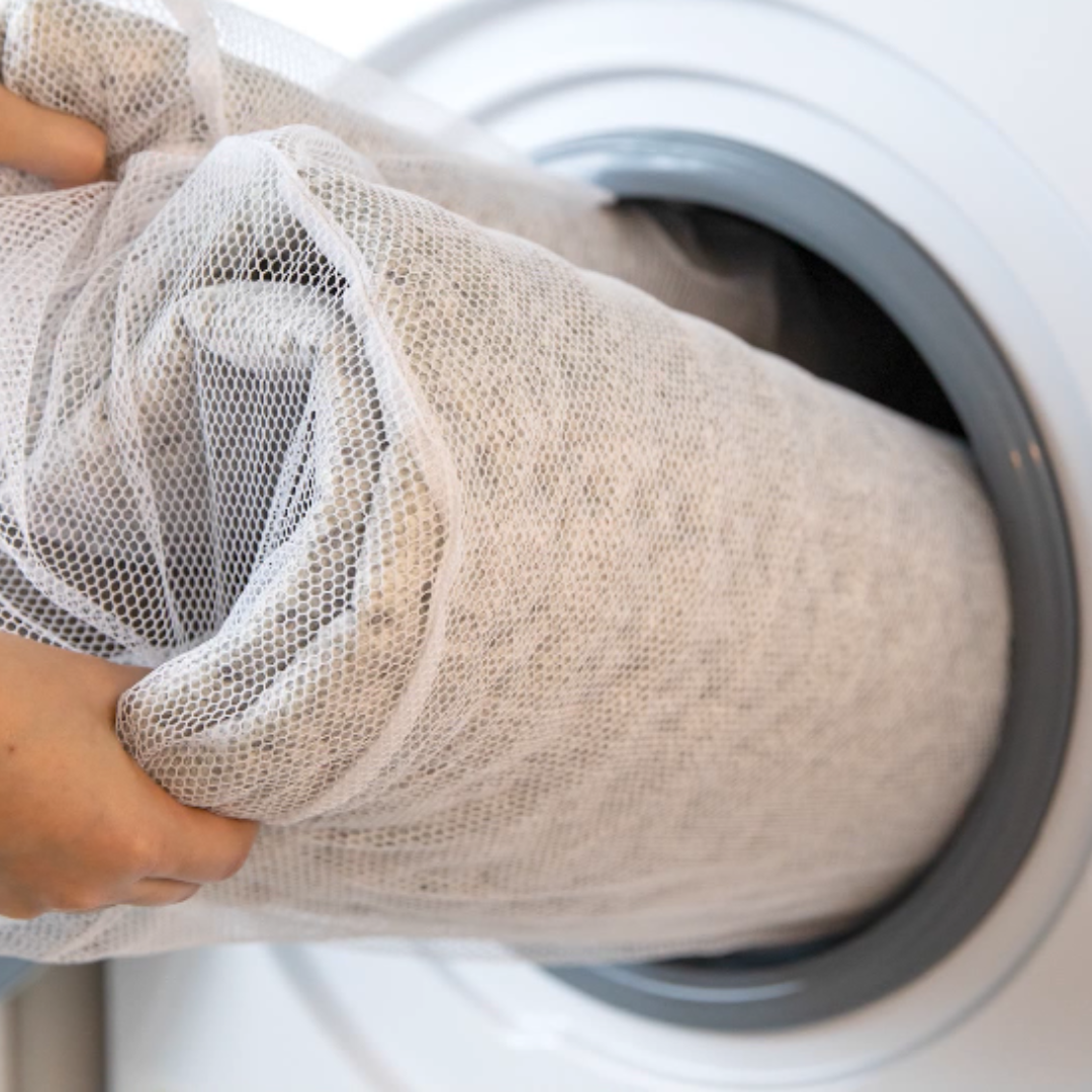 専用洗濯ネットに入れて洗濯機で丸洗いして、自然乾燥。