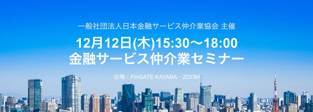 一般社団法人日本金融サービス仲介業協会では、金融サービス仲介業の拡大および利便性の高い金融仲介サービスの提供につなげるため、12月12日(木)15時半から「金融サービス仲介業セミナー」を開催いたします。