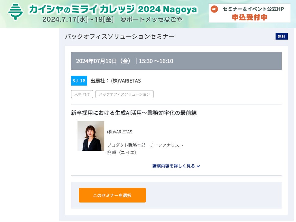 書類選考から一次面接を担当する「AI面接官」を開発するスタートアップ、株式会社VARIETAS(読み方:バリエタス)は、2024年7月17日から19日にかけて開催される【名古屋】HR EXPO (人事労務・教育・採用) 2024において、「新卒採用における生成AI活用〜業務効率化の最前線〜」と題したセミナーを開催いたします。