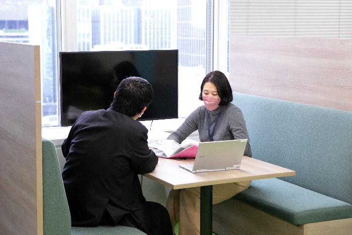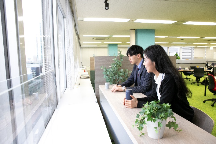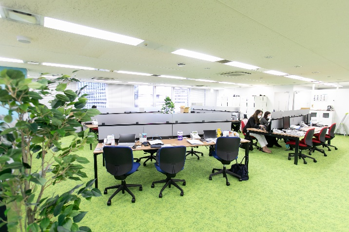 東京都新宿区の本社に次いで、新しい働き方に対応し、業務内容に応じて柔軟に働く場所を選択できる、フリーアドレス制を導入。「三菱地所の住まいリレー」ブランドカラーであるブルー系と爽やかなグリーン系でまとめたインテリアデザインで、明るくオープンな空間を演出。