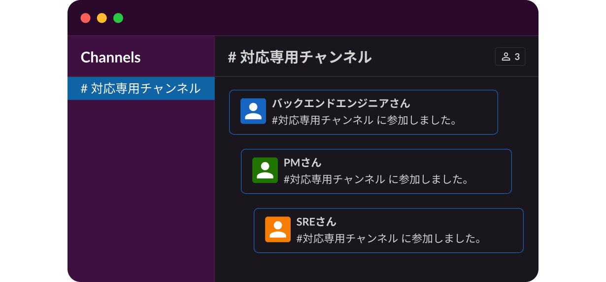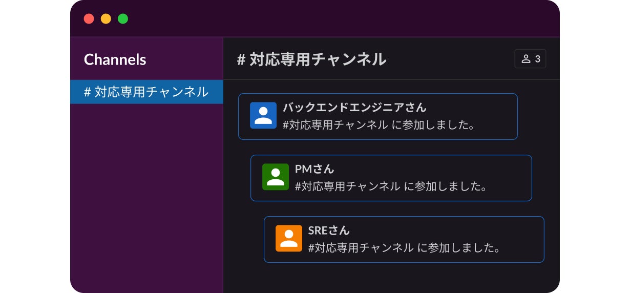 インシデント対応に関わるメンバーを登録しておけば、専用チャンネル作成時に自動的にメンバーを招待することができるため、チャンネル作成時の手間やミスを削減できます。