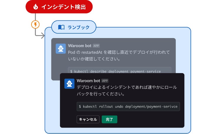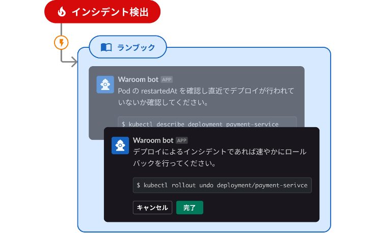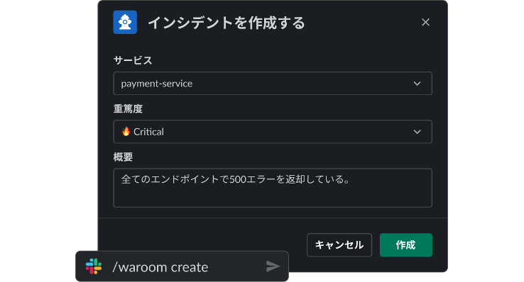 迅速な対応を行うためには、コミュニケーションを円滑に行う仕組みを構築するとともに、手作業を可能な限り自動化する必要があります。Waroomを使えばSlack上で復旧対応を完結させることができます。また、生成AIを用いてドキュメントの作成の手間を削減できます。