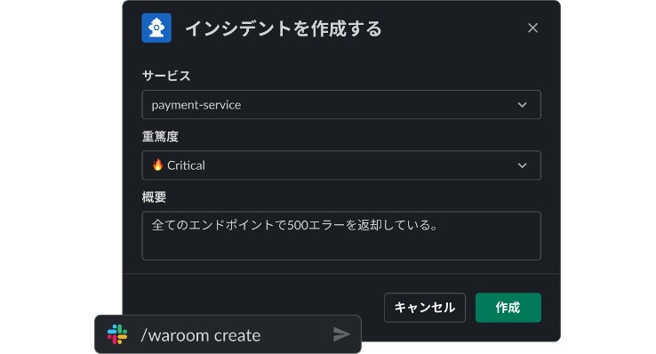 インシデントの起票やステータス更新などをSlackのUIから行うことができます。また、インシデントごとに専用のSlackチャンネルをワンボタンで作成できます。