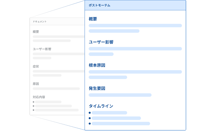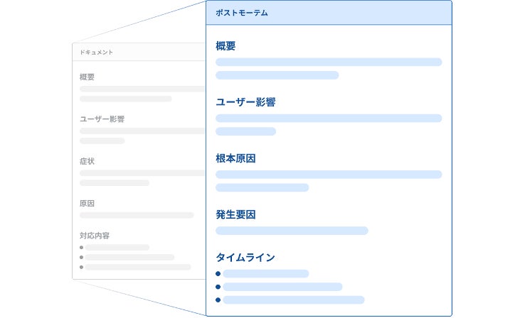 インシデントステートドキュメントやSlackのメッセージの内容をもとにポストモーテムを自動生成します。概要やタイムラインなど記入の手間がかかる部分もAIが生成するため、ポストモーテムに取り組む負担が軽減されます。