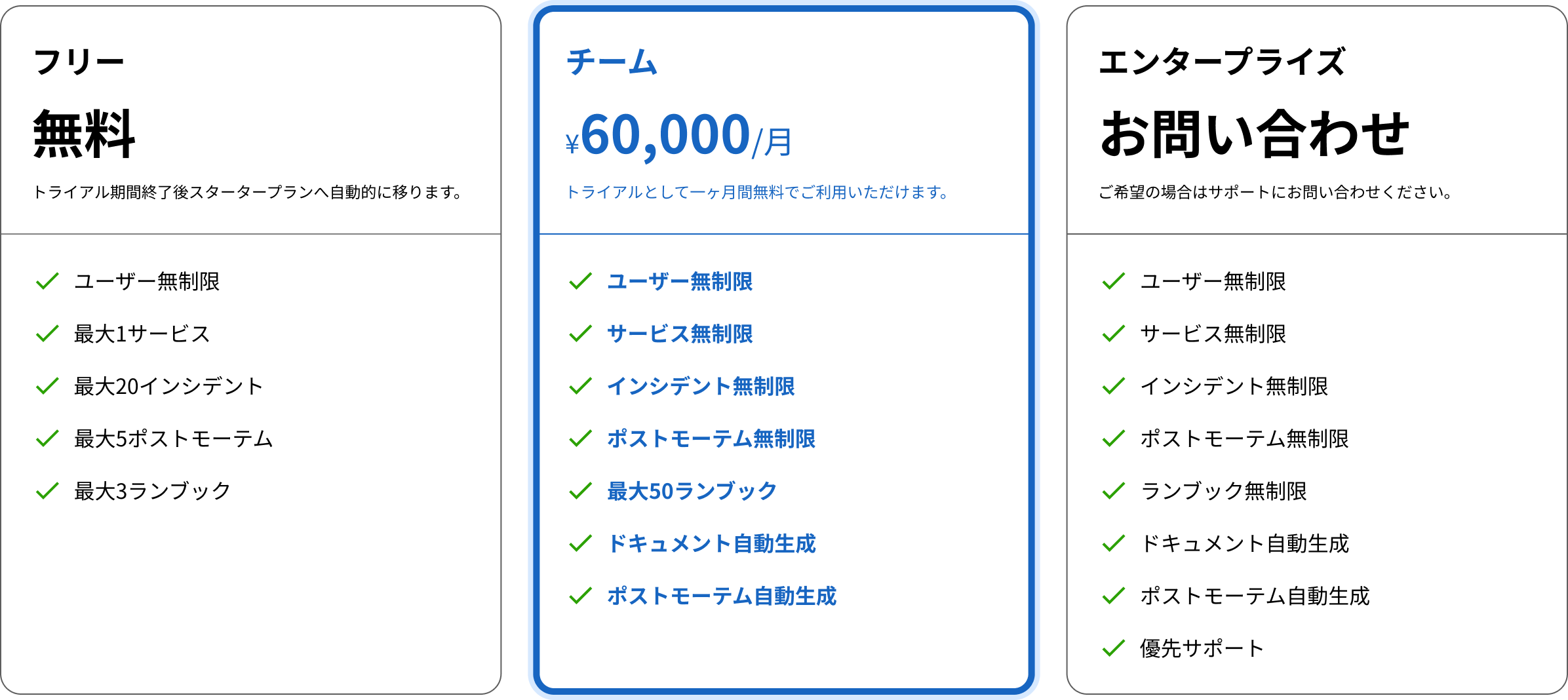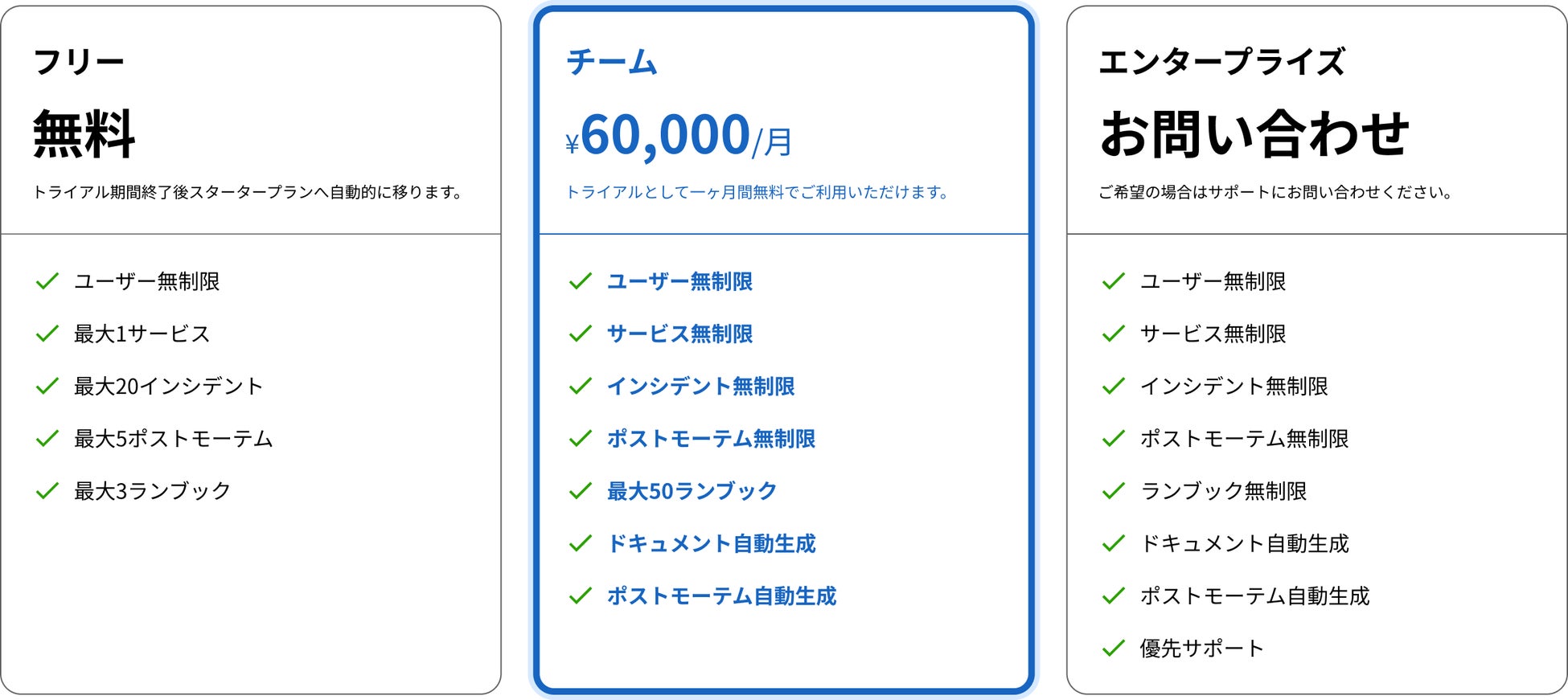 システムの復旧対応を行うエンジニアだけでなく事業責任者や顧客対応を行うメンバーなど、さまざまな役割のメンバーを巻き込みながらインシデント対応に取り組むことを想定し、ユーザー単位の課金ではなく組織全体で一律の料金体系になっています。30日間の無料トライアル期間中は全ての機能が利用できます。