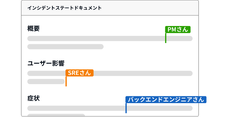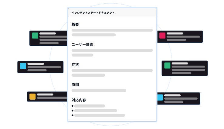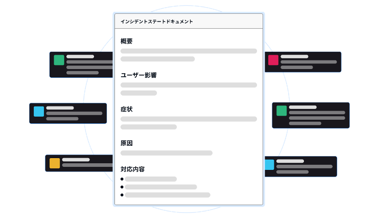 Slack上のコミュニケーションの内容からインシデントステートドキュメントを自動生成します。ドキュメントから現在のインシデントの状況を把握することができるため、社内メンバーへの情報共有やふりかえりに必要なドキュメント作成の負担を軽減することができます。
