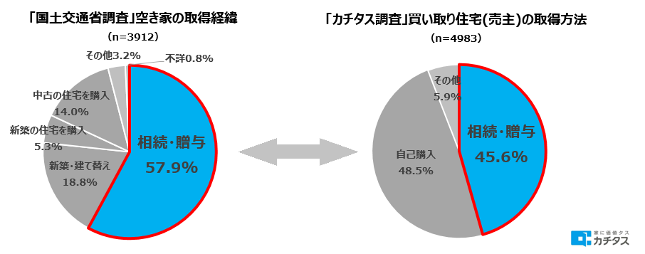 調査実施の前提として、国土交通省が実施した「令和元年空き家所有者実態調査(以降、国土交通省調査)」と、弊社への「中古住宅売却者の実態に関する調査(以降、カチタス調査)」を比較分析しました。その結果、「空き家の取得方法」について相続・贈与の割合が近しく、「空き家の所在地」のエリア比率も類似しており、傾向が近しいことが明らかとなりました(※)。即ち、弊社の事業領域と全国の空き家実態には強い相関があると認識しました。そのような状況を踏まえ、加速する日本の空き家問題の解決により一層貢献するために、市場の状況や課題を捉えるべく、昨年から「空き家所有者に関する全国動向調査」を実施しています。