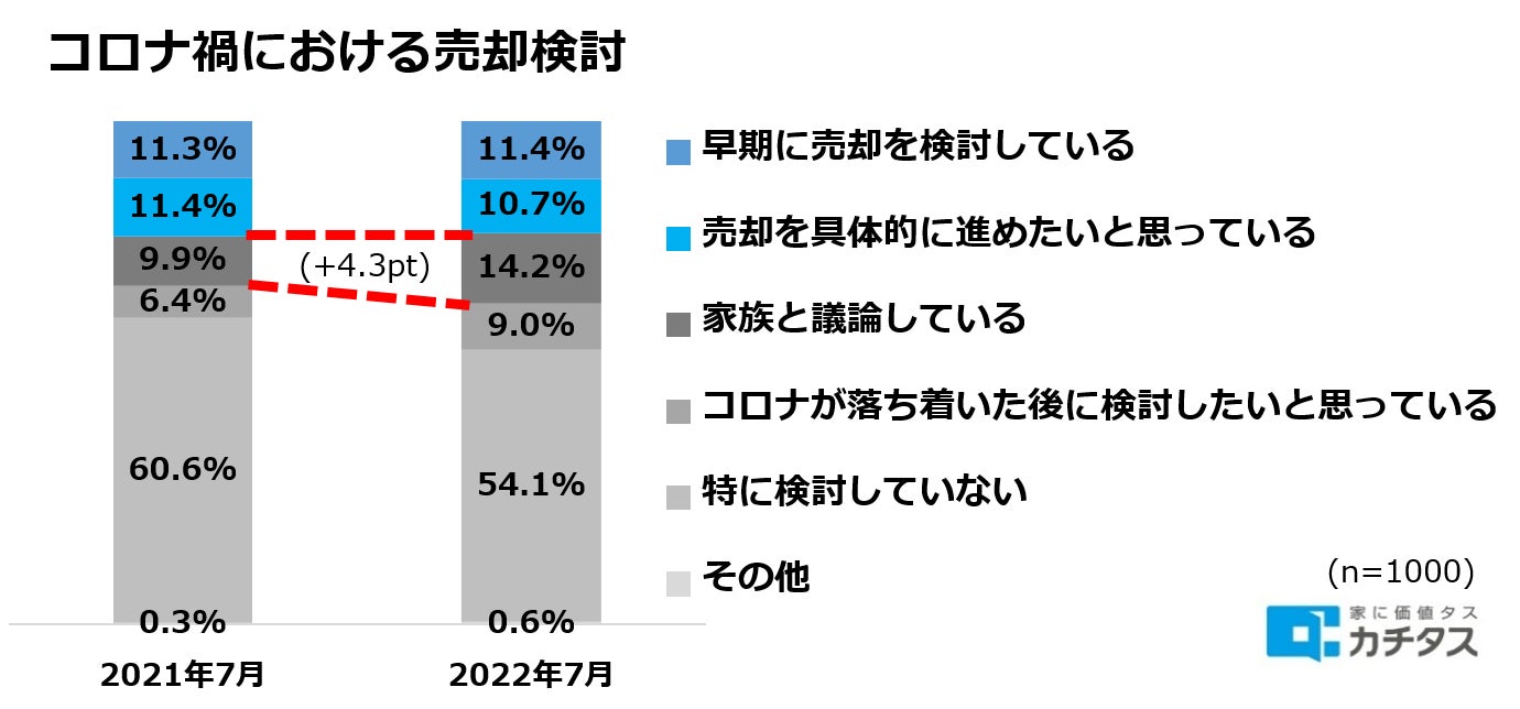 1.コロナ禍における売却検討者は、22.1%で前回と同等。家族と議論していると答えた人は、14.2%で前回よりも増加している。