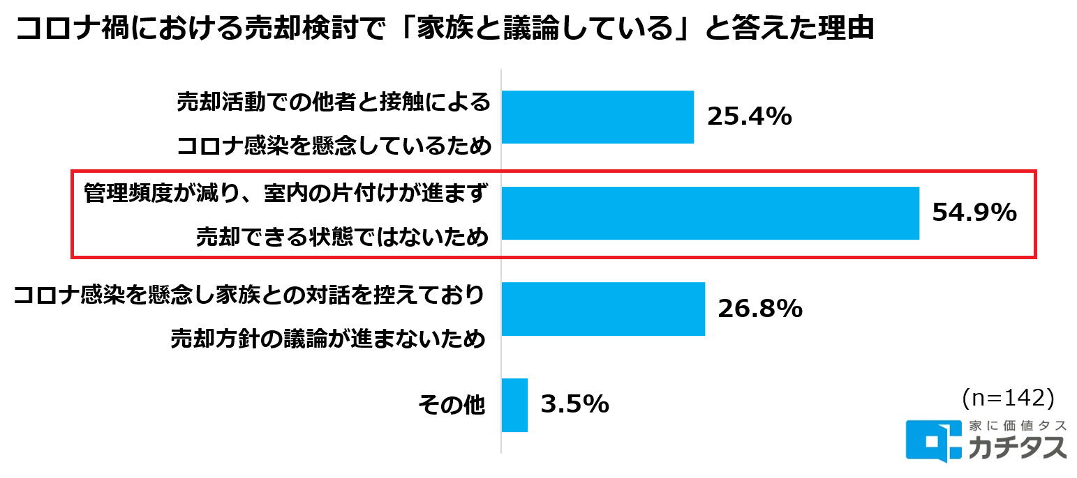 - 2. コロナ禍での売却意向で「家族と議論している(14.2%)」と答えた人の最も多い理由は、「管理頻度が減り、室内の片付けが進まず売却できる状態でないため(54.9%)」で、売却検討先に最も多く選んだのは「不動産買取会社(51.4%)。