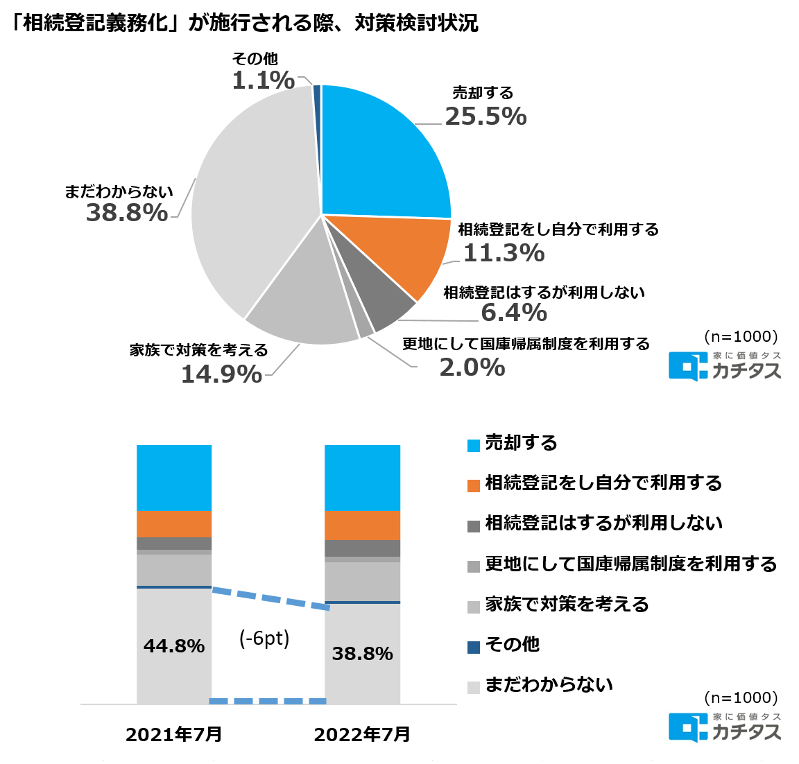 - 相続登記義務化施行時に考える対策は、1位の「まだわからない(38.8%)」で前回より-6.0ポイント、「売却する(25.5%)」が2位で4人に1人の割合。