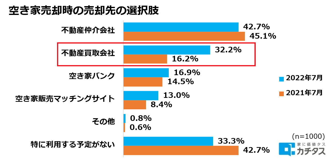 ■「不動産仲介会社」が42.7%で1位で昨年同等、「不動産買取会社」は32.2%で前回より+16.0ポイント上昇。