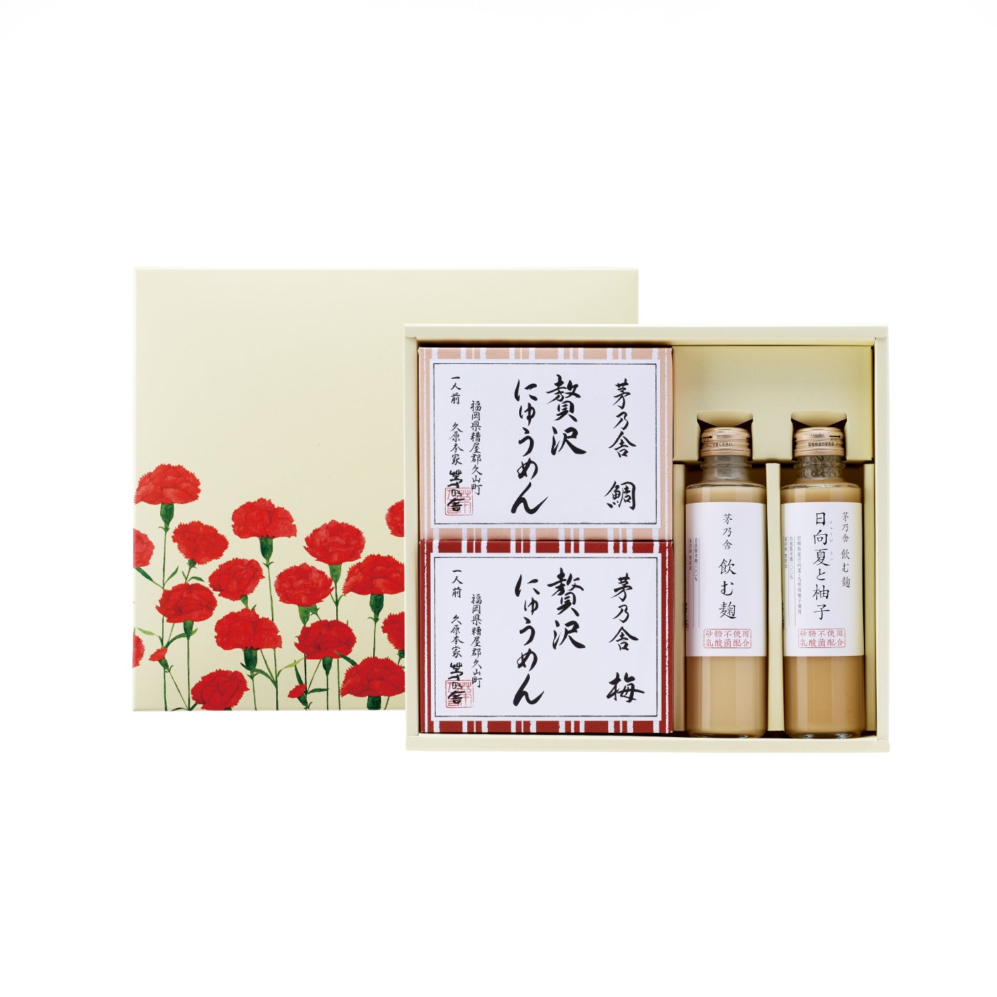 お母さんに、いつまでも美しく健やかにいてほしいという想いを込めたギフトとして、砂糖を使わず、自家製の米麹で仕上げた発酵飲料「飲む麹」を特別販売します。通常は限定店のみの販売品ですが、カーネーション柄の限定箱に「贅沢にゅうめん」と詰め合わせた限定ギフトをご用意しました。