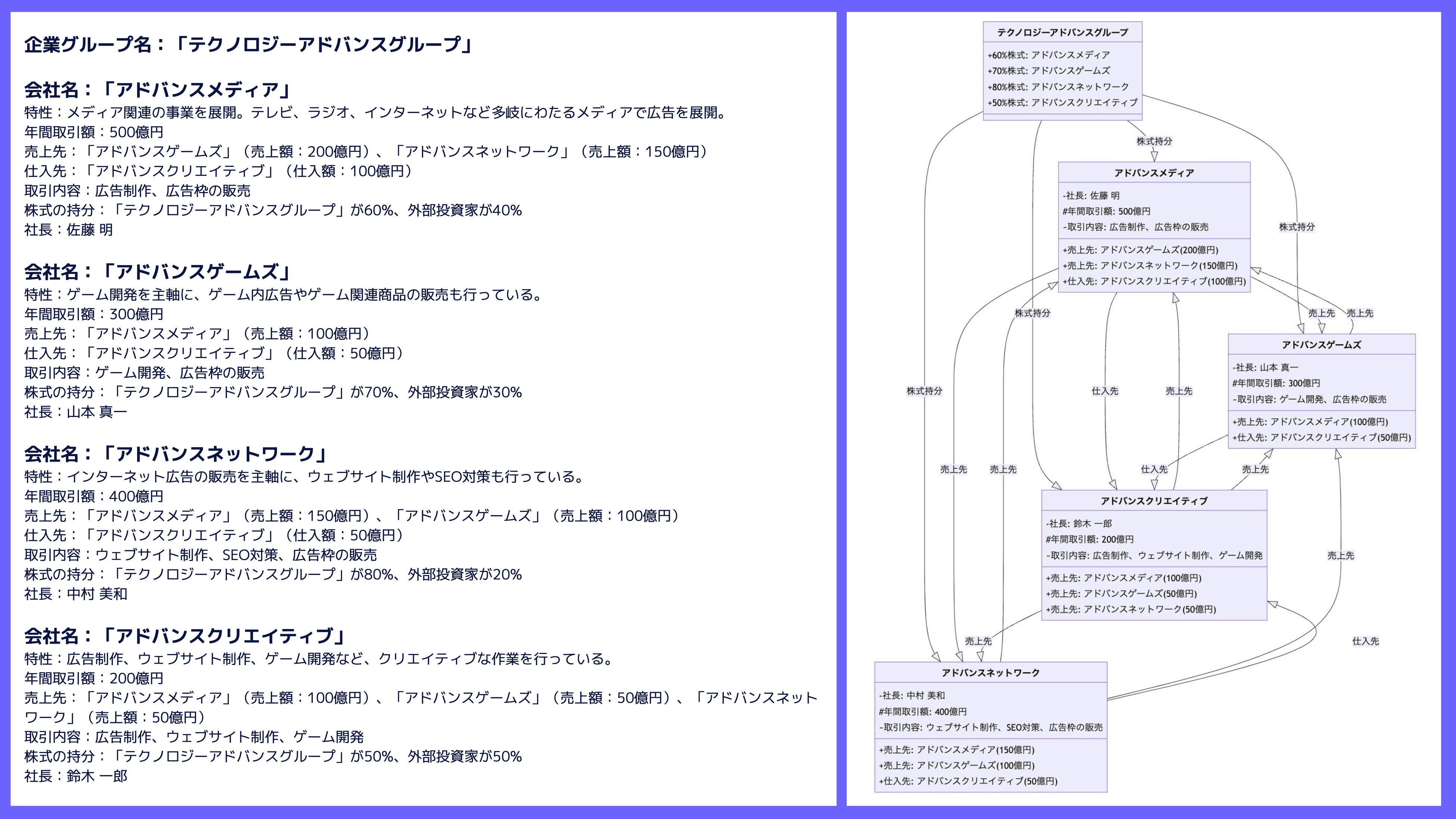 ある日、会議の資料作りに追われていました。5つのグループ会社間の財務状況、商流、取引先との関係性を一覧で見ても、全体像を掴むのは難しいものでした。しかし、図形生成AIを使うと、ほんの1分で、図が完成しました。これがなければ、3時間以上の作業時間が必要だったことでしょう。その結果、久しぶりに家族と夕食を共にする時間を確保できました。