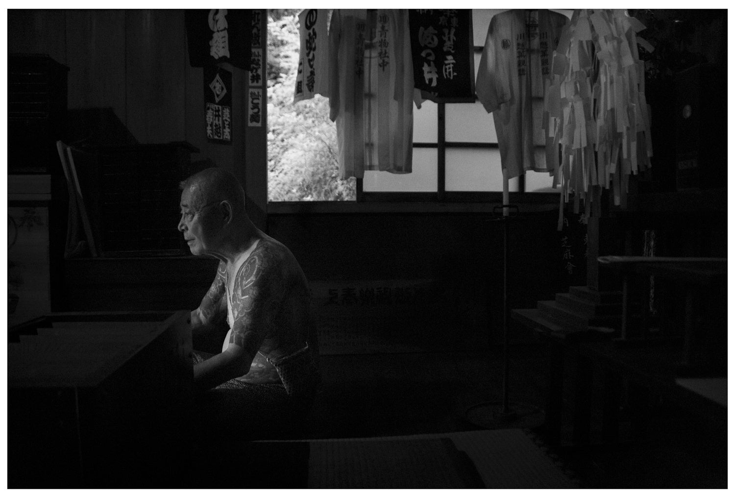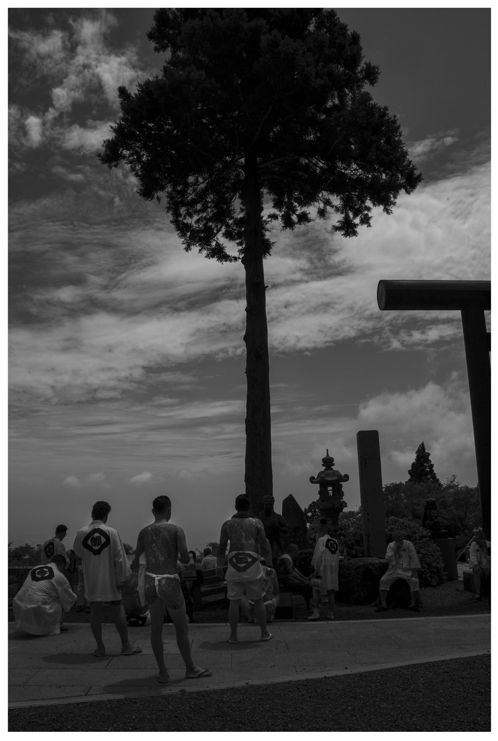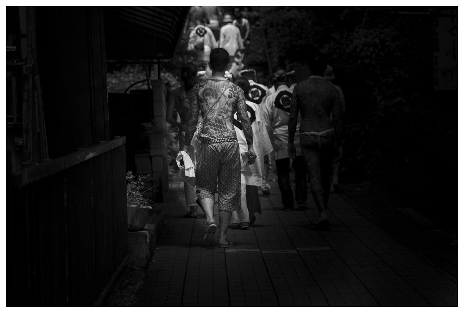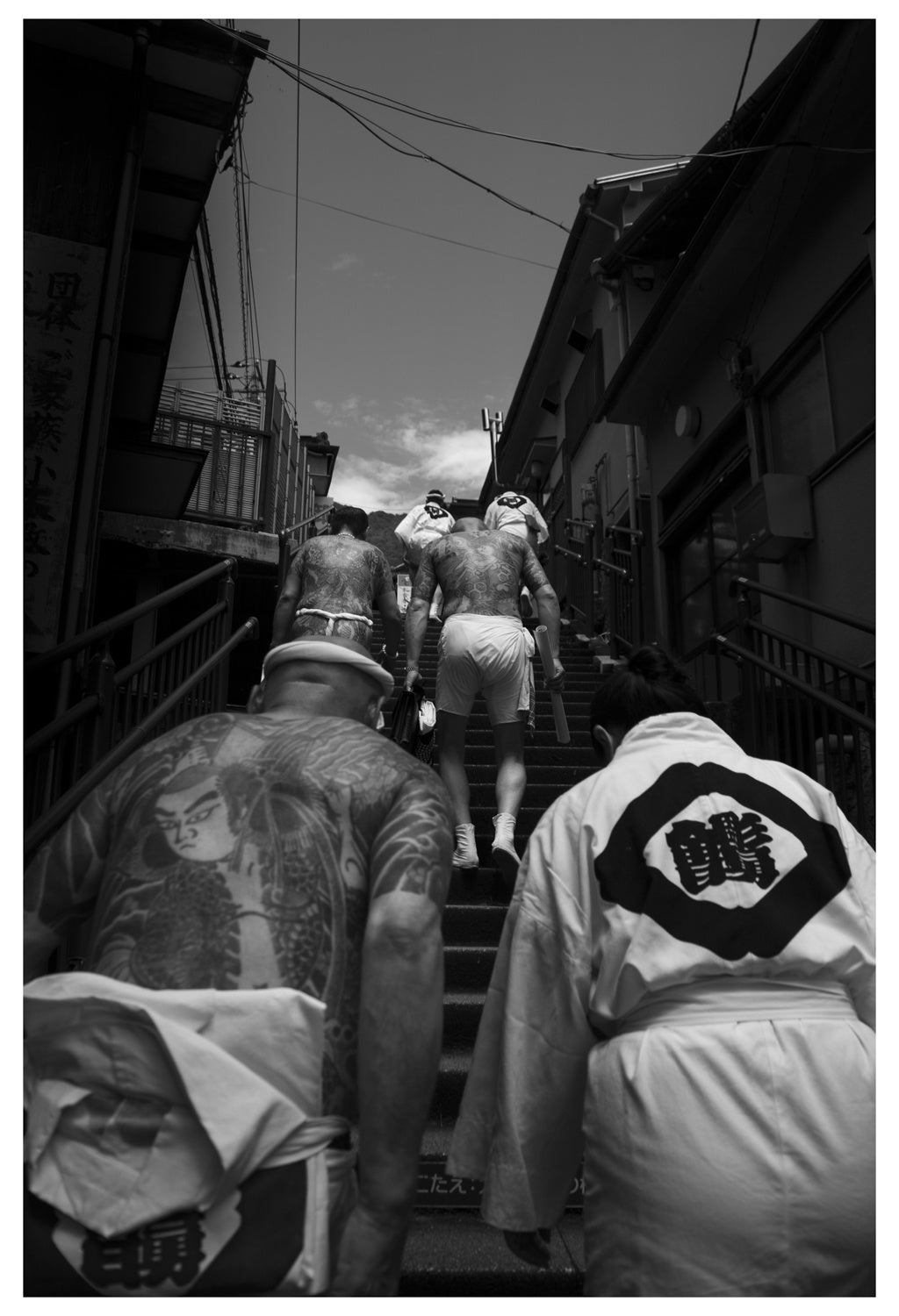 現在も数十人が在籍しており、一年に一度行われる「大山詣り」では、総身(そうみ)の肌もあらわな締め込み姿で、普段は人に見せることのない背中の”彫り物”を露わにし、滝で身を清めてから奉納と山頂を目指す。