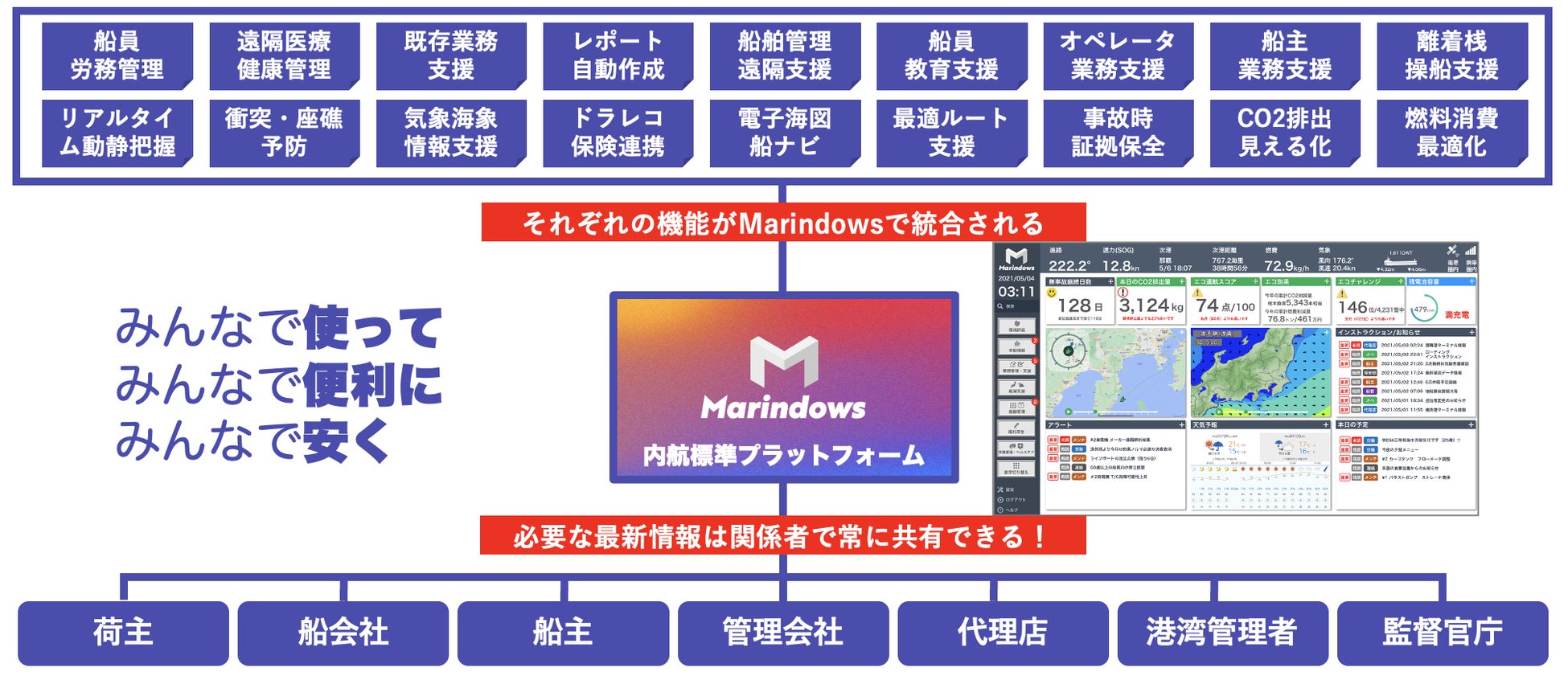 内航海運という枠を超え、我々の目の前に広がるフロンティア『海洋』の「環境」「生産性」そして「魅力」を高めるために必要な海洋OS『Marindows』の設計を進めます。
