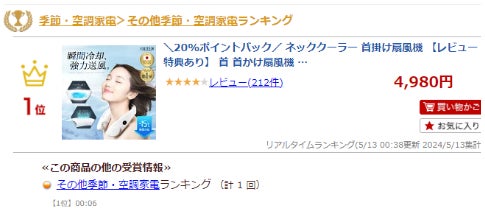 楽天ランキング(リアルタイム)その他季節・空調家電部門1位(2024年5月13日時点)