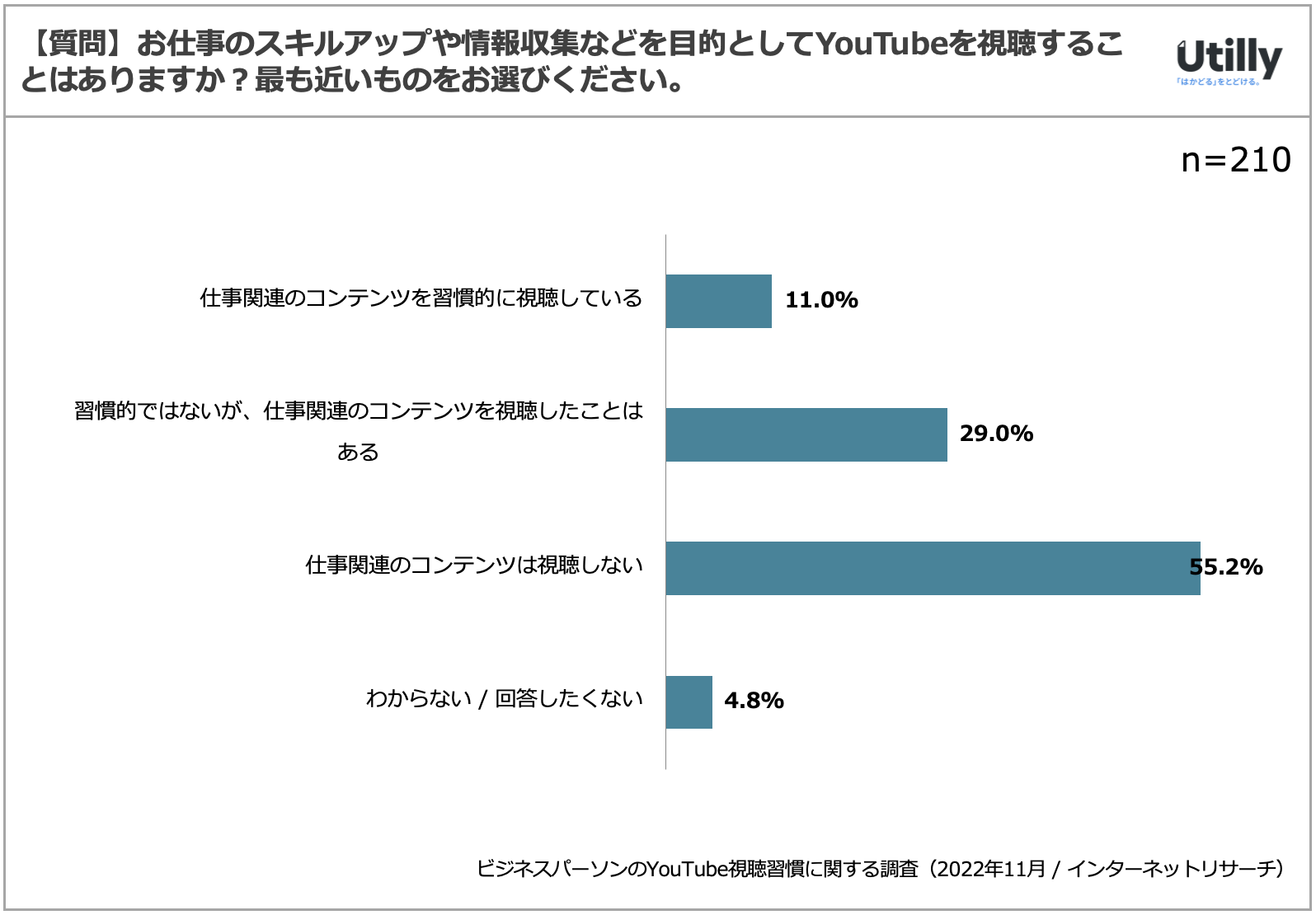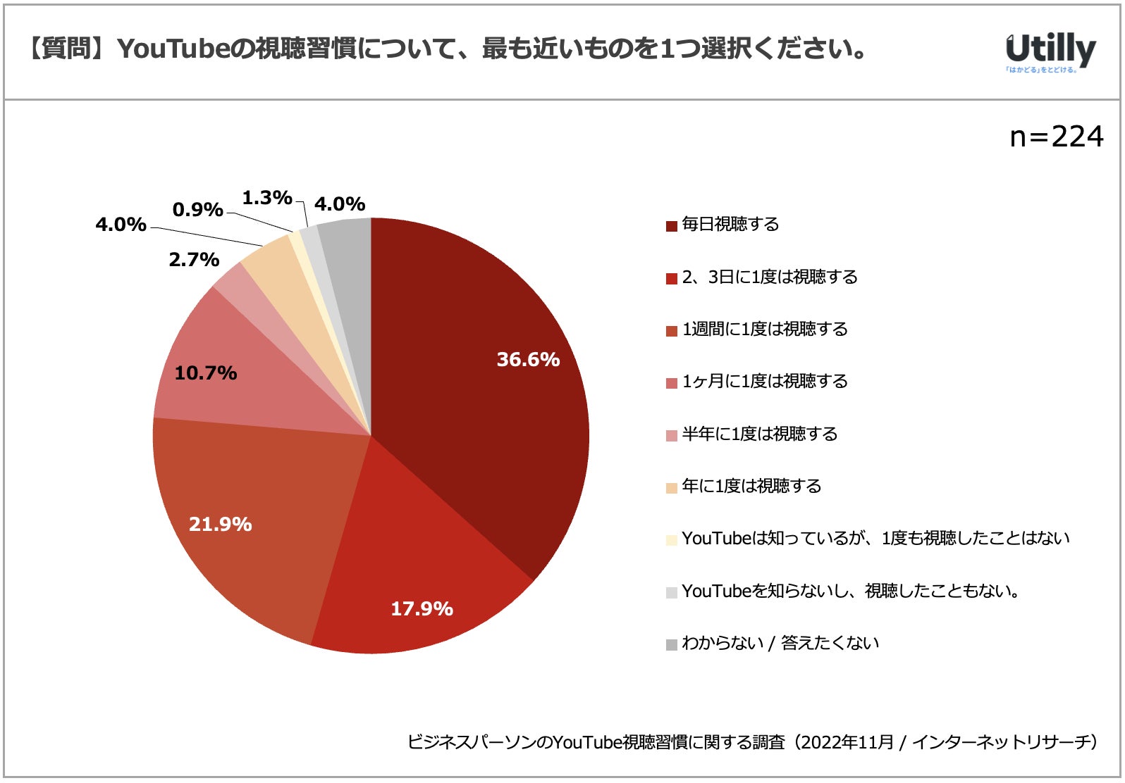 BtoBサービスの比較メディアUtilly(運営会社:株式会社GO TO MARKET、所在地:東京都渋谷区)では、2022年11月にビジネスパーソンのYouTube視聴習慣に関するアンケート調査を実施しました。