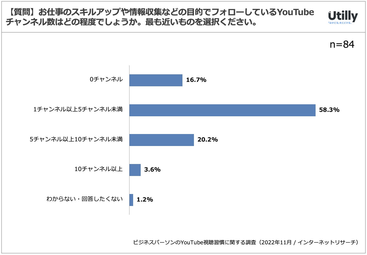 YouTubeで仕事関連コンテンツについて視聴経験のあるビジネスパーソンが、仕事のスキルアップや情報収集などの目的でフォローしているYouTubeチャンネル数は「1チャンネル以上5チャンネル未満」が58.3%と最も多い結果となった。