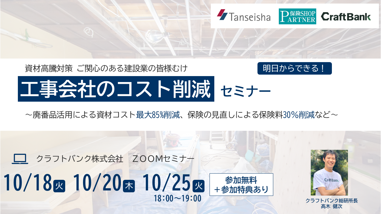 建設DXのスタートアップ・クラフトバンク株式会社は、10月18日、20日、25日の3日程で無料オンラインセミナー「明日からできる!工事会社のコスト削減セミナー」を開催します。本セミナーでは建設会社向けに「即効性ある具体的な」コスト削減策を3点お伝えします。参加者限定の特典もあります。