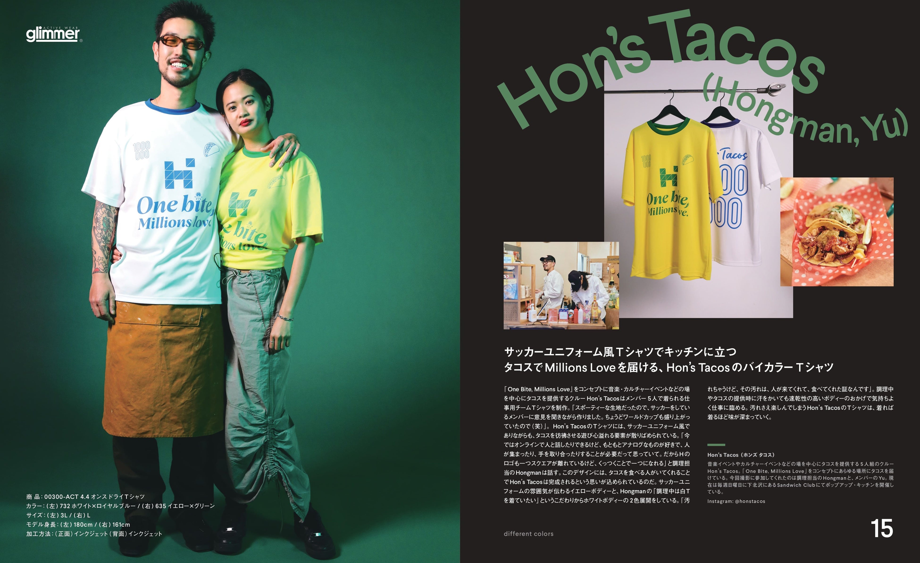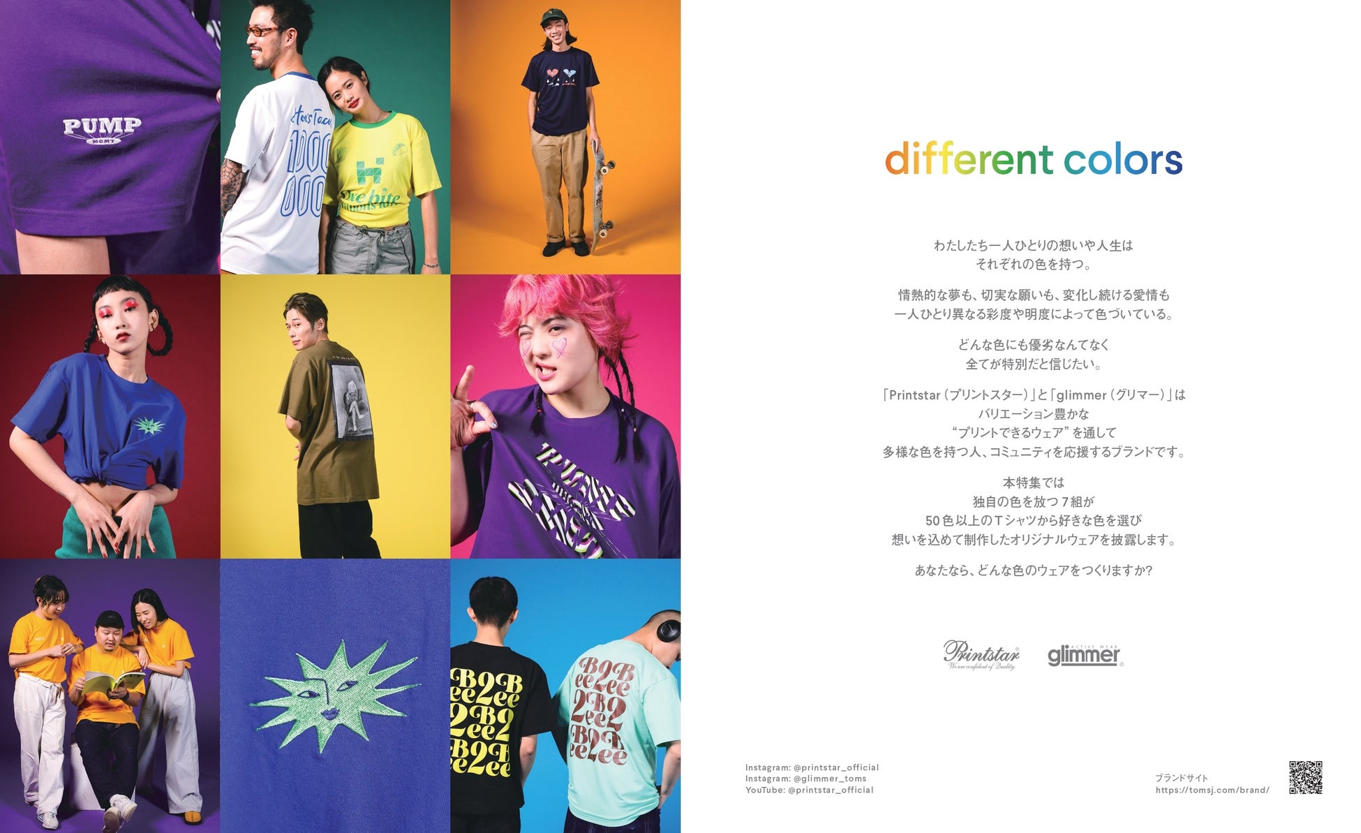 今回の巻頭特集「different colors」では、独自の色を放つ7組の出演者たちが、50色以上のカラバリを持つ「5.6オンス ヘビーウェイトTシャツ」(Printstar)「4.4オンス ドライTシャツ」(glimmer)の中から1枚を選び、想いを込めたオリジナルウェアを制作し、披露しています。