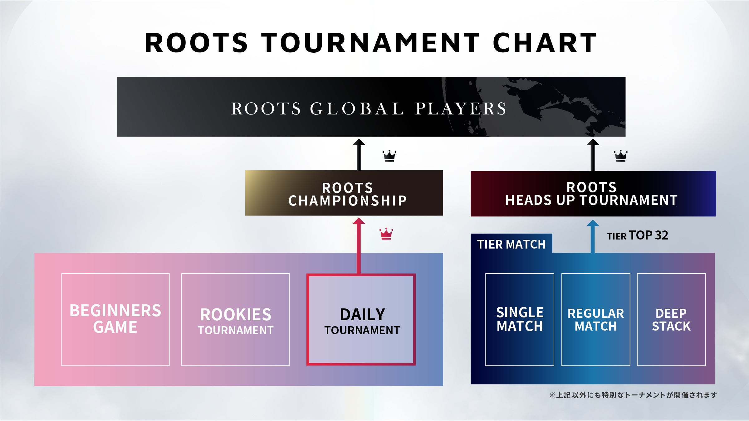 そのため、ROOTSで行われるさまざまな勝ち残り形式のトーナメント戦の最終ゴールは、"ROOTS GLOBAL PLAYERS"になり、海外のポーカーに挑戦できるチャンスを掴む、という設計にしています。POKER ROOMがROOTS GLOBAL PLAYERSの海外での活躍をサポートします。