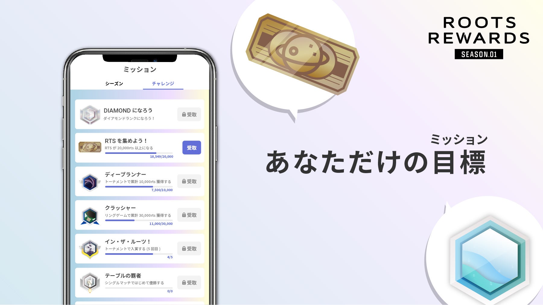 Season.1では、アプリ内に「トーナメントで優勝する」といったポーカーの実績に関するものや、フードやドリンクを注文することで達成できるものなど、100を超える多種多様なミッションが登場。ROOTSでのさまざまな行動によってミッションを達成した人にしか味わえない特別な体験をご用意しています。