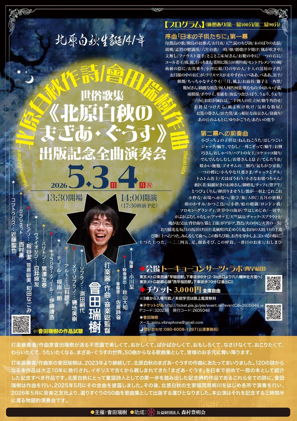 會田瑞樹作曲 世俗歌集《北原白秋のまざあ・ぐうす》セレクションが音楽之友社より2026年5月に刊行決定。出版を記念した全曲演奏会を2026年5月3,4日、トーキョーコンサーツ・ラボにおいて開催。