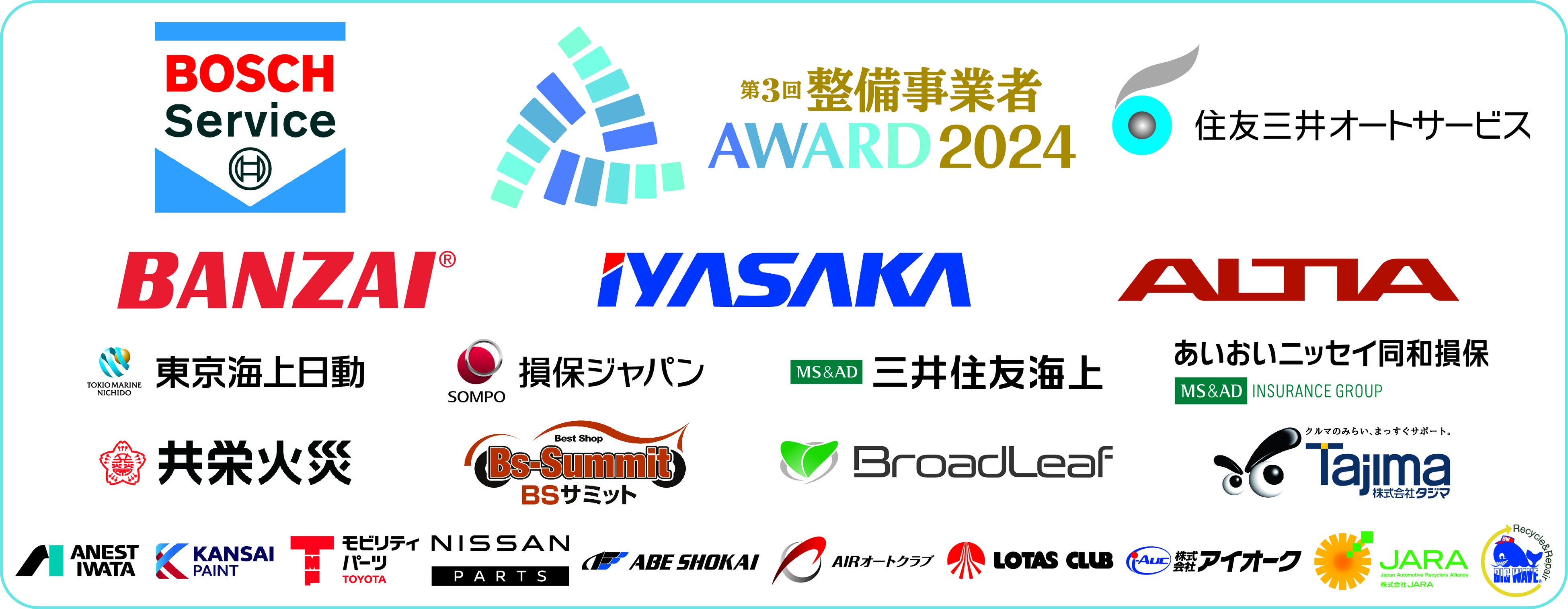 ボッシュカーサービス/住友三井オートサービス株式会社/株式会社バンザイ/株式会社イヤサカ/株式会社アルティア/東京海上日動火災保険株式会社/損害保険ジャパン株式会社/三井住友海上火災保険株式会社/あいおいニッセイ同和損害保険株式会社/共栄火災海上保険株式会社/BSサミット事業協同組合/株式会社ブロードリーフ/株式会社タジマ/アネスト岩田株式会社/関西ペイント株式会社・関西ペイント販売株式会社/トヨタモビリティパーツ株式会社/日産自動車株式会社/株式会社阿部商会/AIRオートクラブ/全日本ロータス同友会/株式会社アイオーク/株式会社JARA/株式会社ビッグウェーブ