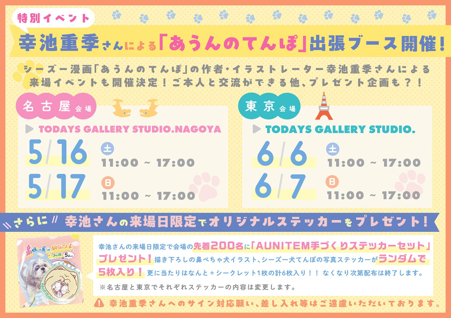 さらに、来場者特典として「AUNITEM手づくりステッカーセット」をプレゼント!描き下ろしの鼻ぺちゃ犬イラストや、シーズー犬てんぽの写真を使用した全5枚入りの特別セットです。ステッカーは全10種+シークレット1種をランダムで封入し、シークレット当選時は6枚入りに。なお「名古屋」「東京」で内容が異なり、コレクションとしてもお楽しみいただけます。