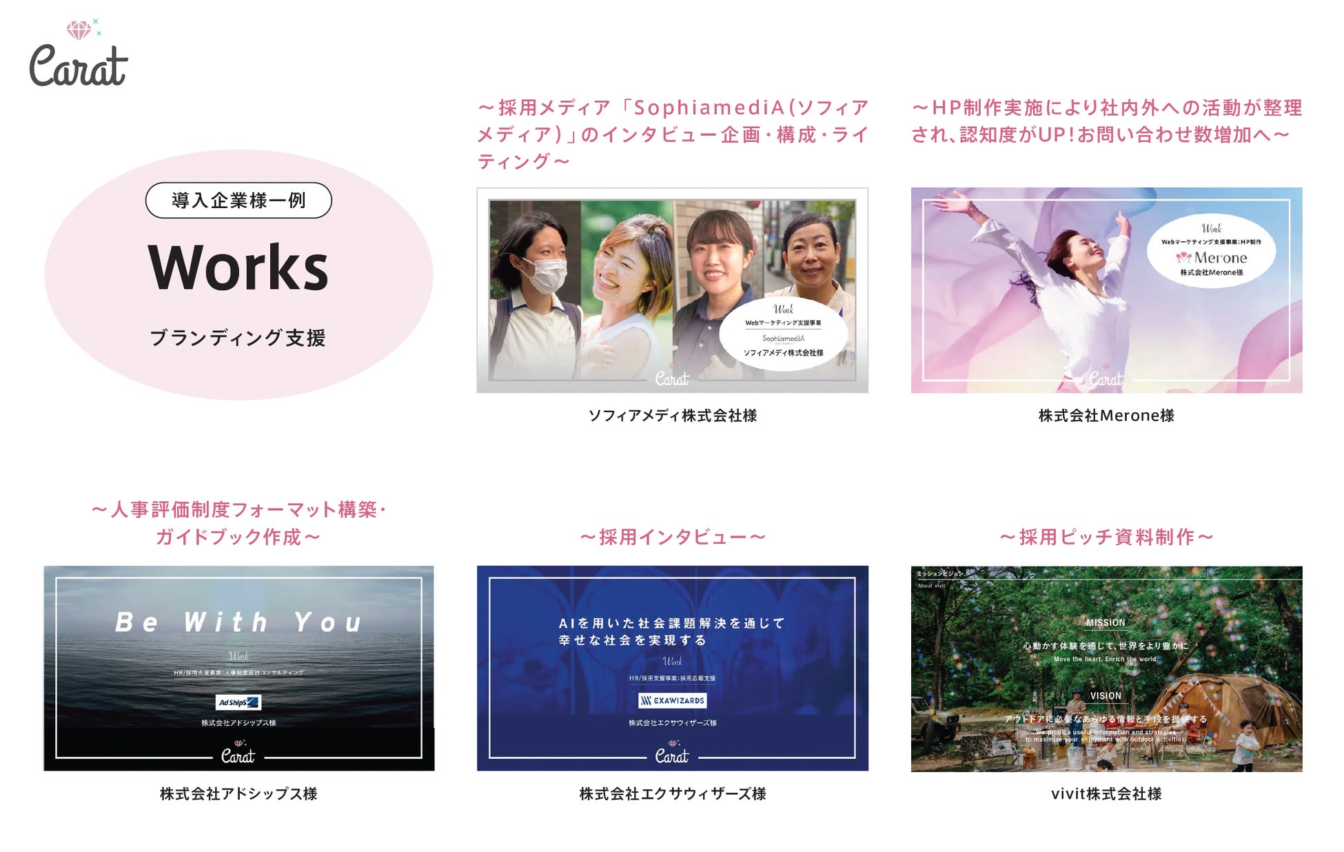 Carat株式会社は、全員が女性、全員がフルリモートワークのプロジェクトマネジメントに特化した専門集団です。オーダーメイド型かつ貴社のメンバーの一員として入り込むハンズオン体制で進行することを強みとしています。これまで、完全紹介制にて、主に人事・採用・採用広報・ブランディング領域にて、合計130以上のプロジェクト支援を行ってきました。